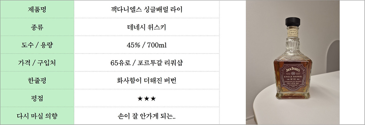 3년 전에 스페인&포르투갈로 신혼여행을 갔을 때, 포르투의 리쿼샵에서 뭣도 모르고 사버린 싱글배럴 라이는 이제 와서 보니 정말 잘 샀던 것 같다. 한국에는 100프루프나 셀렉트는 구하기도 쉽고 온누리나 지자체 할인을 적용하면 10만원 미만으로 살 수 있는데, 라이 같은 경우는 찾기가 쉽지 않다. 그만큼 희소성이 높은 싱글배럴 라인 중 하나인 것이다. 사실 내가 못 찾은 것일 수도 있는데, 위스키를 매달 1~2병 씩 사는 내가 찾기 힘든 정도면 사실상 한국에서는 구하기 쉽지 않다는 것이 내 결론이다. 그렇다 보니 라이를 산 것은 정말 잘한 일이다. 그렇다고 맛도 좋은가? 그렇지는 않다. 사실 내 혀가 둔감한 것도 한 몫하지만 라이라고 해서 캐릭터가 더 도드라지지는 않는다고 생각한다. 조금 더 뾰족하다고 표현하는데, 산뜻한 감은 있지만 잭다니엘스 같은 테네시 위스키와 결일 크게 차이가 나지는 않는다. 이미 뚜다한지 3년이 지났고, 그 말인 즉슨 에어링이 3년 됐다는 것인데, 그래서 그렇게 됐을 수도 있다고 생각한다.