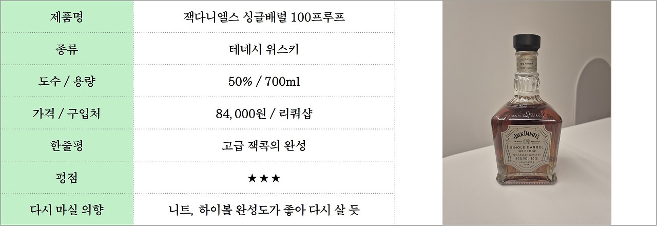 이제 잭다니엘스 SBBS만 남았다. 사실 내가 산 것은 구형이라 64.5%이다. 최근에 나온 신형은 62.5%라서 도수가 약간 낮아졌다. 구형을 아직 뚜따하기 전이라면, 좀 더 간직했다 드시면 좋겠다. 사실 버번류의 위스키들은 도수가 깡패인지라 높디 높은 도수는 잘 간수했다가 정말 좋을 때 따야 한다고 생각한다. 만약 신형 SBBS를 즐기고 싶다면, 차라리 짐머레이가 추천한 1792 풀프루프를 시도해 보는 쪽을 추천한다.