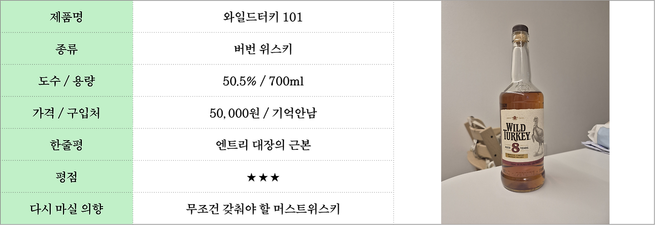 메이커스마크, 버팔로트레이스와 함께 버번 위스키 엔트리 삼대장인 와일드터키 시리즈를 소개하려고 한다. 그중 단연코 스테디셀러인 와일드터키 101에 대해서 내 취향을 기준으로 설명해보겠다.