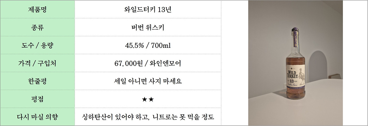 사실 버번에서 13년 숙성은 같은 와일드 터키 증류소에서 만드는 러셀 리저브 13년이 가장 유명할 것입니다. 그러니 같은 숙성연수인 와일드 터키 13년에 대한 기대가 높았습니다. 물론 데일리샷이나 온라인 리뷰에서 호불호가 강하다는 우려도 좀 있었지만, 마침 와인앤모어에서 할인하여 6만 원대에 구할 수 있었습니다. 그래서 별 고민 없이 구매했는데, 맛이 없었습니다. 너무 쓰고 라이트 해서 손이 잘 가지 않았습니다.