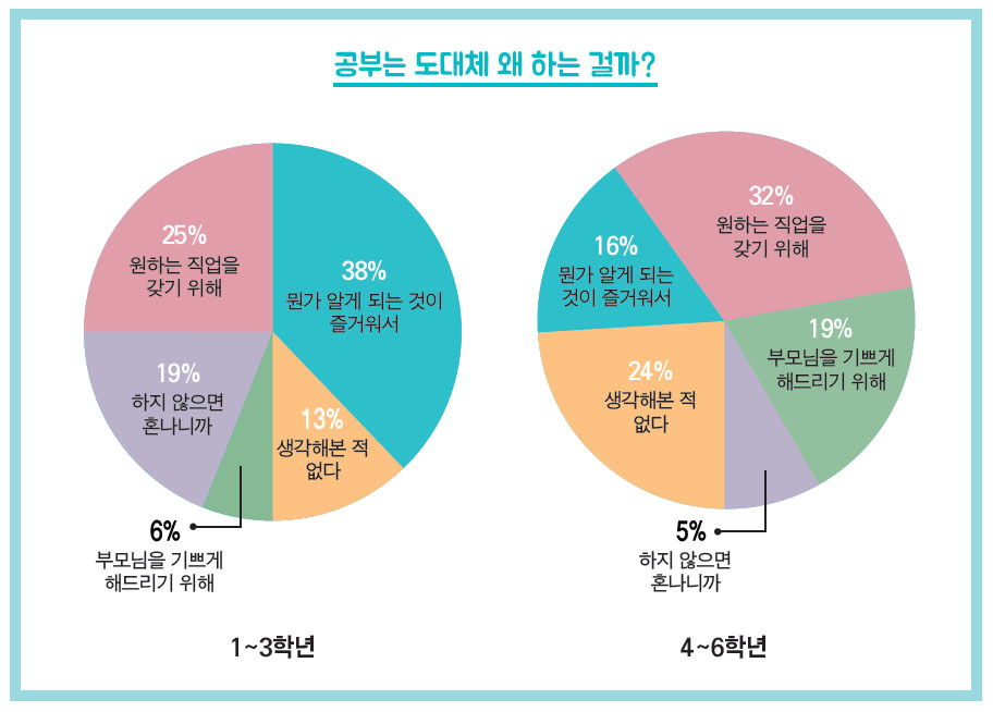 공부를 왜 하느냐는 질문에 나를 위해 한다는 답을 하는 경우는 의외로 많지 않습니다. 하지 않으면 혼나니까(=부모님이나 선생님을 위해), 부모님을 기쁘게 해드리기 위해(=부모님을 위해), 친구들이 다들 하니까(=친구 관계를 위해), 생각해본 적 없다(=아무 생각없이 한다)는 의견이 많죠. 절반 이상으로 나오는 통계도 드물지 않고요.