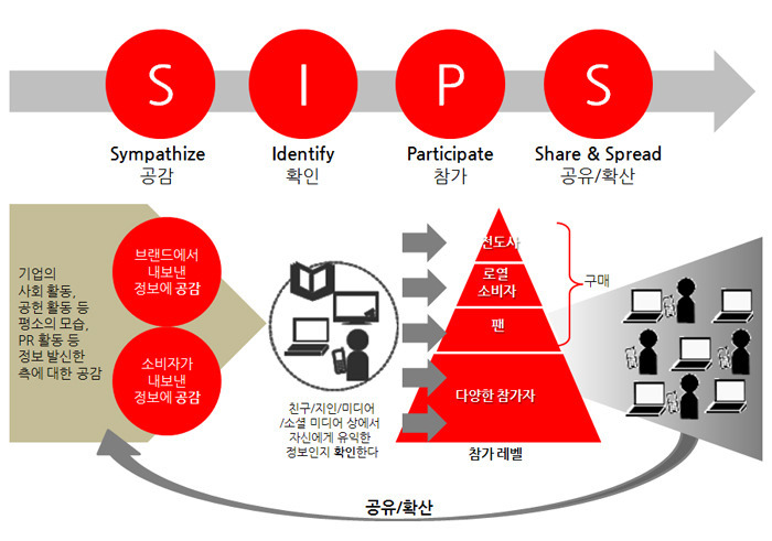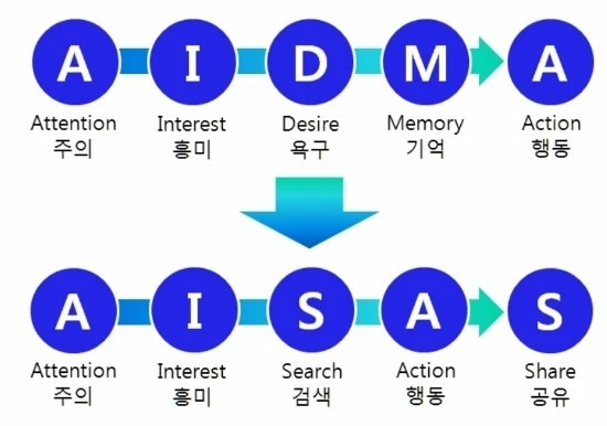 디지털 시대 이전에는 AIDMA 의 개념이 통용되었습니다. 'Attention(주의/관심) - Interest(흥미) - Desire(욕구발생) - Memory(기억해뒀다가) - Action(구매 등 행동)' 의 순서로 소비자 행동이 진행되었죠. 그러다가 인터넷 시대가 오며, 이 모델은 AISAS 로 바뀝니다. 검색과 공유라는 새로운 행동 패턴이 나타나게 되면서 'Attention(주의/관심) - Interest(흥미) - Search(검색) - Action(구매 등 행동) - Share(공유)' 의 순서로 소비자 행동이 변화하게 됩니다. 그리고 SNS 등 개인 중심의 미디어가 자리를 잡으며 이는 다시 위에서 말씀드린 SIPS 로 변화하게 된 것입니다. 물론 앞으로 또 새로운 소비자 행동 패턴 개념이 나타나겠죠.