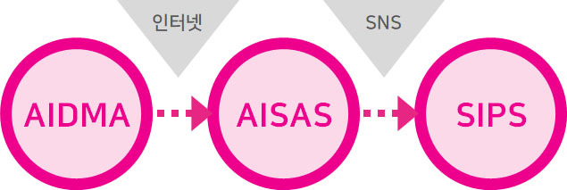 <AIDMA 에서 AISAS 를 거쳐 SIPS 까지 위의 변화가 있었습니다>
