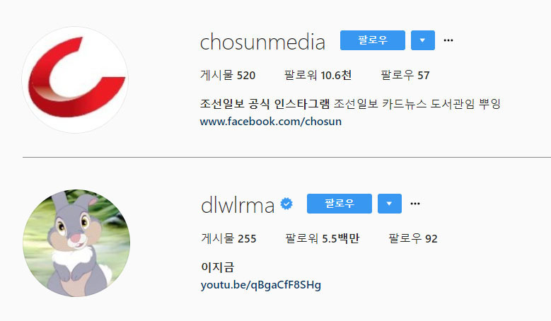 <인스타그램에서 조선일보는 약 1만 명, 아이유는 약 550만 명의 팔로워가 있습니다. 인스타그램에서 아이유가 조선일보에 비해 약 550배의 컨텐츠 확산력을 가지고 있네요>