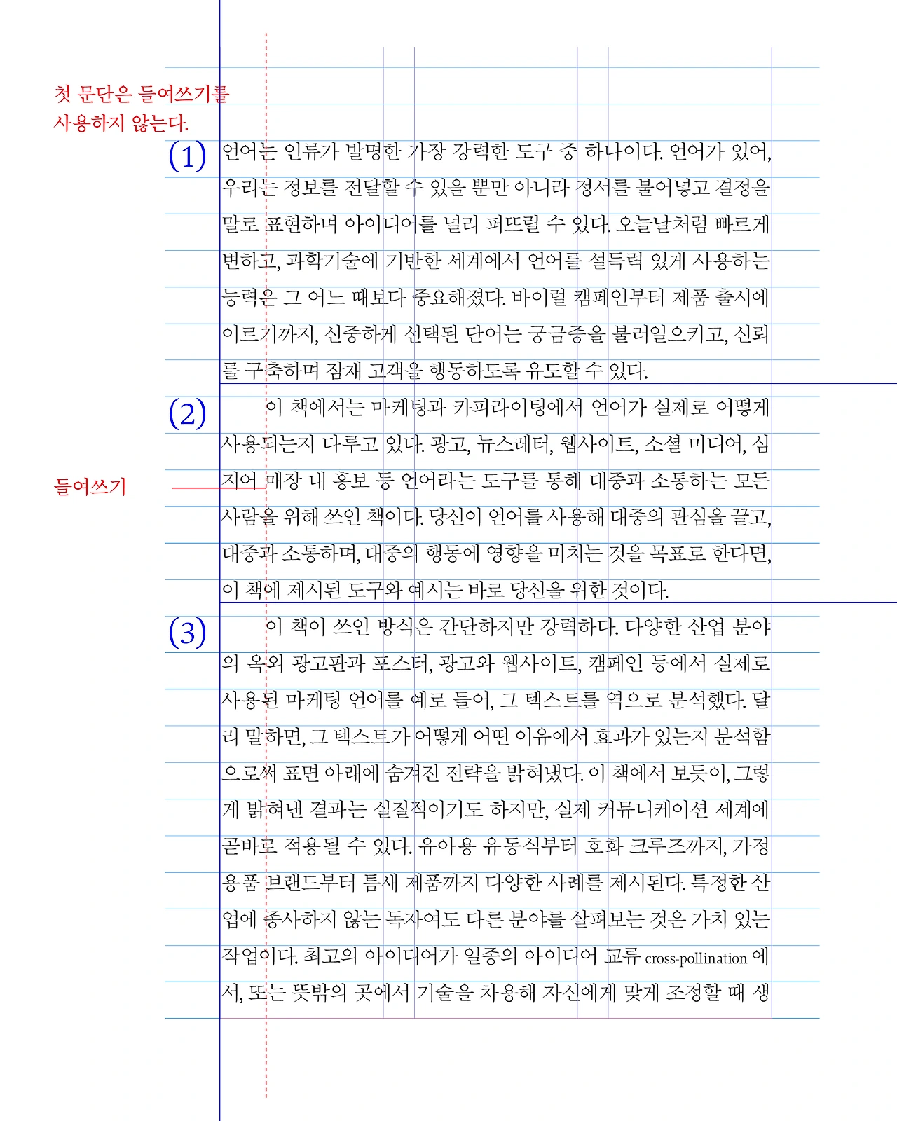 타이포그래피의 관점에서 한국어 들여쓰기는 이러한 라틴 문자권의 원리를 따르는 편이 더 타당하다는 것이 내 판단이다. 그 이유는 단순히 그 형식이 서구에서 들어왔기 때문이 아니라, 들여쓰기의 본래 기능, 곧 의미의 전환을 시각적으로 표지하는 기능에 더 충실하기 때문이다. 라틴 문자권의 조판 관행에서는 첫 줄 들여쓰기와 문단 사이 공백을 같은 기능을 수행하는 표지로 이해하며, 둘을 함께 쓰지 않는 것이 일반적이다. 또한 제목이나 절 제목 뒤의 첫 문단은 시작이 이미 분명하므로 들여쓰지 않고, 이후의 연속 문단에만 들여쓰기를 적용하는 방식이 널리 쓰인다. 따라서 첫 문단은 들여쓰지 않고, 이어지는 문단에만 들여쓰기를 적용하며, 문단 사이에 한 줄 공백을 둘 경우에는 다시 들여쓰지 않는 방식이 더 옳다. 이것은 라틴 문자권을 형식을 맹목적으로 답습하자는 것이 아니라, 들여쓰기를 기의와 기표의 관계 속에서 본래의 기능에 맞게 다시 사용하자는 제안이다. 결국 한국어 들여쓰기의 문제는 규칙의 부재만이 아니라, 기의와 기표의 불일치, 즉 의미보다 형식이 앞서 굳어졌다는 데 있다. 그러므로 이제 들여쓰기는 단순한 편집 습관이 아니라 문단의 의미 구조를 시각적으로 조직하는 타이포그래피의 문제로 다시 다루어져야 한다.