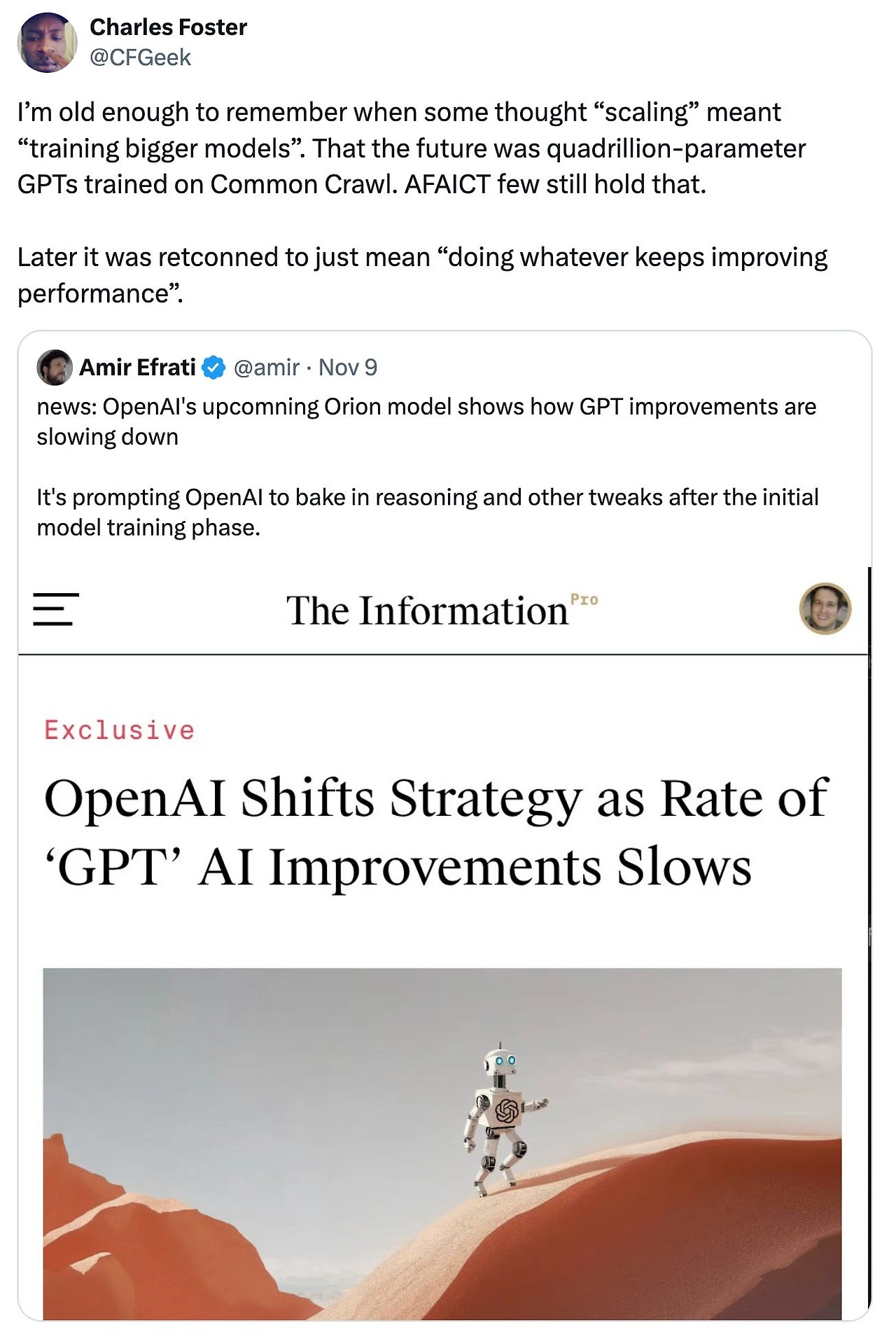 하지만 서튼의 교리가 확산되면서 정의들이 변형되기 시작했다. 이는 모든 살아있고 활기찬 종교의 징후다 - 트집잡기, 확장, 주해(註解). "스케일링 법칙"은 이제 단순히 컴퓨팅을 스케일링하는 것만을 의미하지 않으며, 몇 가지 트릭을 더해 트랜스포머와 컴퓨팅의 성능을 향상시키기 위한 다양한 접근 방식을 지칭한다.