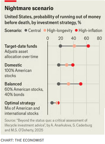 다른 연구자들은 한 걸음 더 나아간다. 최근 연구에서 에모리대학교의 아이잔 아나쿨로바, 애리조나대학교의 스콧 세더버그, 미주리대학교의 마이클 오도허티는 투자자들이 포트폴리오의 3분의 1을 미국 주식에, 3분의 2를 나머지 세계의 주식에 보유해야 한다고 제안한다. 39개국의 수백 년 데이터를 기반으로, 그들은 매년 은퇴 저축의 4%를 인출하는 투자자들이 단기 채권에만 투자할 경우 39%의 확률로 자금이 고갈되는 반면, 균형 잡힌 포트폴리오는 17%, 그들이 선호하는 전체 주식 전략은 단 7%의 확률을 가진다고 추정한다.