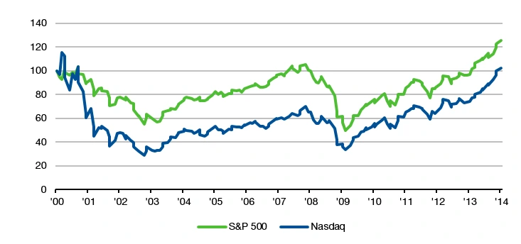 2000년 말에는 S&P 500는 10% 손실에 비해 Nasdaq 투자로 40%의 손실을 입었을 것이다. 하지만 더 나쁜 것은, 2013년 12월까지 13년이 걸려서 손실이 회복되었다는 점이다. S&P 500에 투자하면 손실이 적을 뿐만 아니라 복구 시간도 단축될 수 있으며 2013년 말까지 S&P 500에 투자했으면 25.3% 수익을 얻었을 것이다. 이는 13년이란 기간 동안 큰 수익은 아니지만, Nasdaq을 보유함으로써, 투자자들은 실질적으로 자신의 부를 4분의 1로 줄인셈이다.
