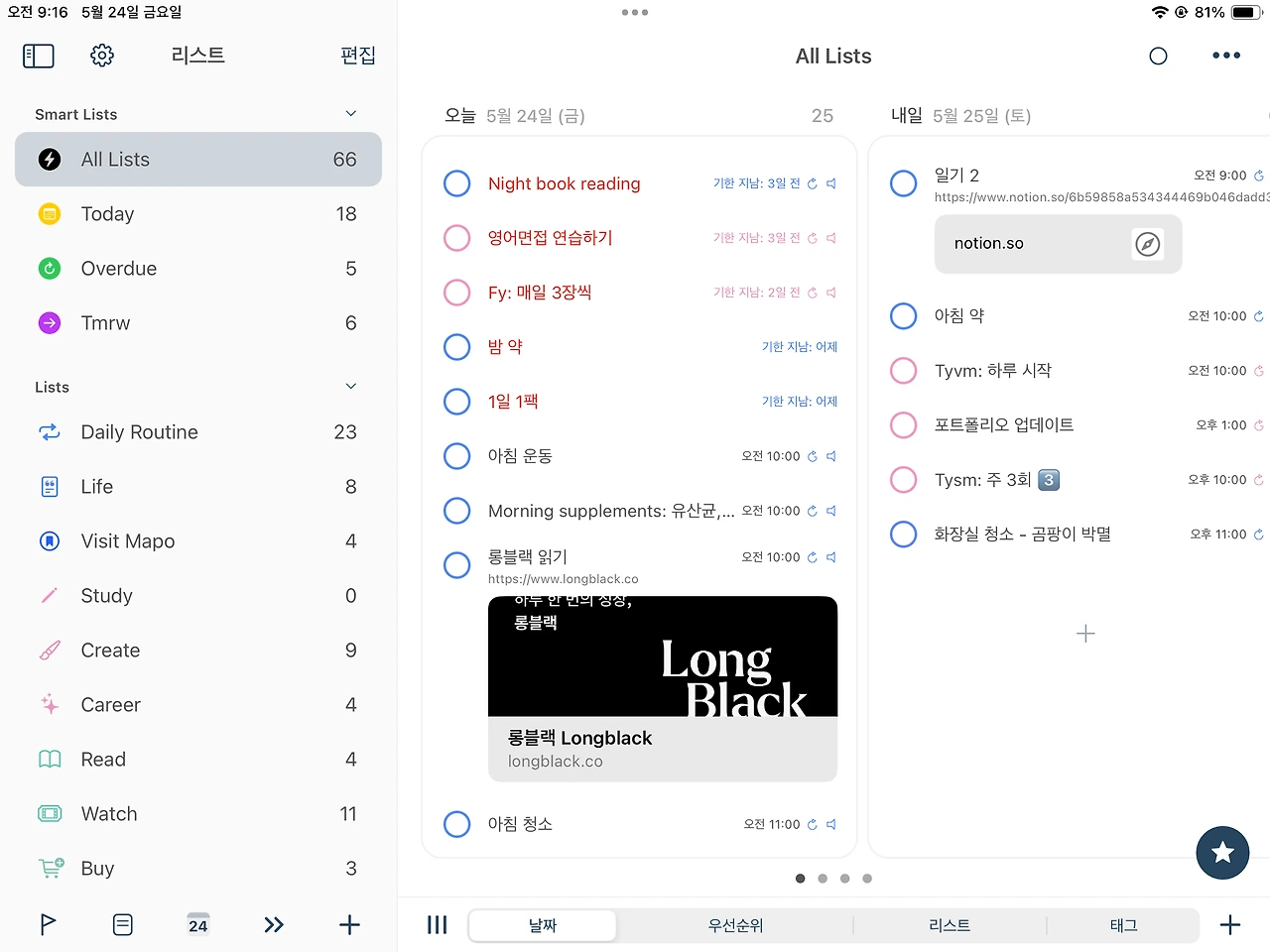 이 어플은 유튜브 채널 '소람'님의 채널 영상 중 굿태스크 사용법 영상으로 알게 되었는데, 루틴을 정리해 주고 + 알람까지 주어서 나의 니즈에 딱 들어맞았다. (영상: 아이패드 앱 | 계획적인 삶에 가까워지는 | Goodtask 사용법 (youtube.com))