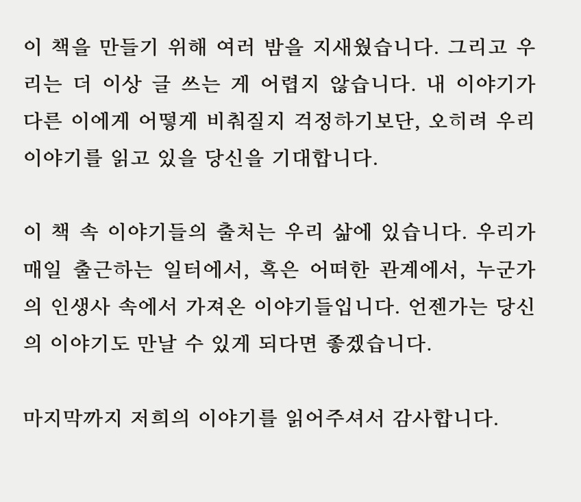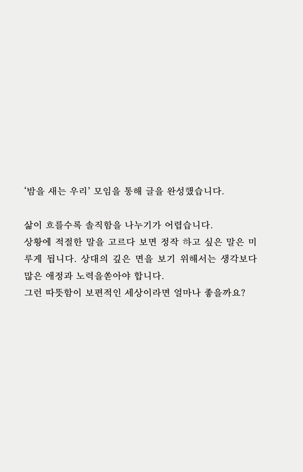 쉽지 않았을 텐데 포기하지 않고, 작품을 완성하는 여정을 끝까지 함께 해준 '밤을새는우리' 글동료들에게 감사 인사를 전한다.