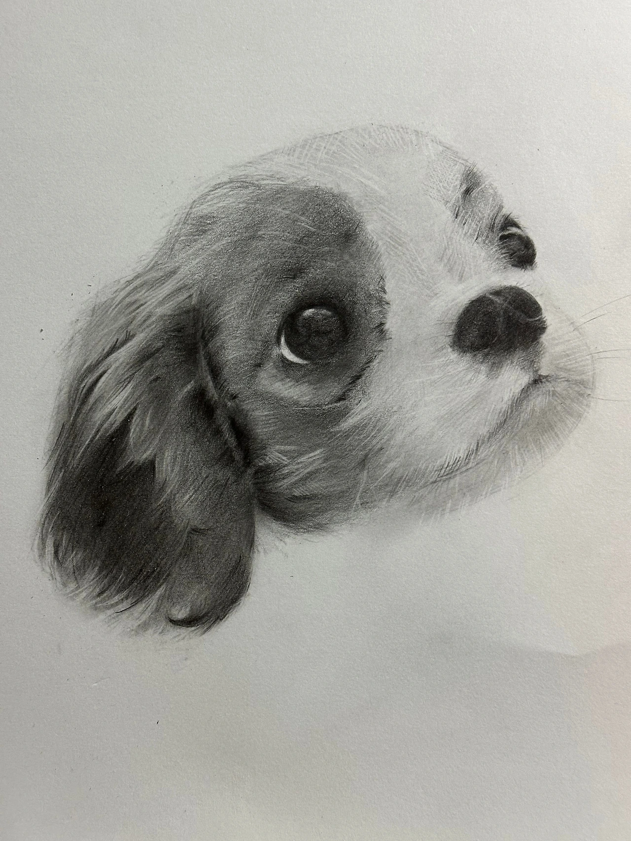 소묘를 위한 준비물은 제법 간단하다. 종이 그리고 연필과 지우개, 이들을 다듬어 줄 커터칼이면 된다. 그렇게 나는 오래전에 사둔 파버카스텔 8B 연필을 꺼냈다. 진한 어둠을 만드는데 제격일 것 같았다. 그리고는 핀터레스트를 뒤적이기 시작했다. 그나마 그리기 쉬워 보이는 강아지 사진을 골랐다. 무언가를 올려다보고 있는 사랑스러운 표정의 강아지다.