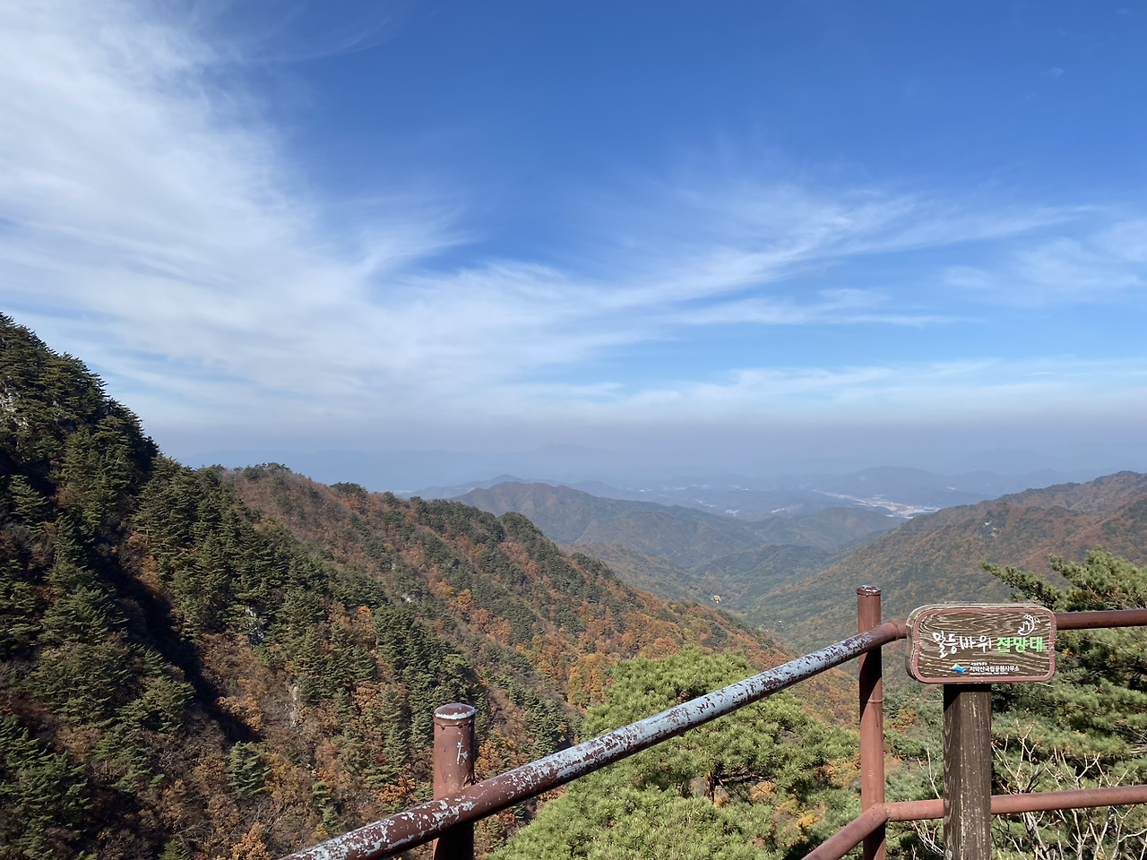사다리병창길 입구에는 새빨간 글씨(색깔부터 심상치 않다)로 ‘탐방구간 매우 어려움’이라는 안내문이 붙어있다. 아니나 다를까 입구를 지나자마자 계단이 보인다. ‘사다리를 세워놓은 것처럼 생긴 벼랑길’이라는 이름에 걸맞게 가파른 계단길은 한참을 계속되었다. 말등바위 전망대까지만 해도 괜찮았던 체력은 정상을 앞에 두고 무너지고 만다. 기력이 너무 떨어진 나는 털썩 주저앉아 김밥을 먹기 시작했다.