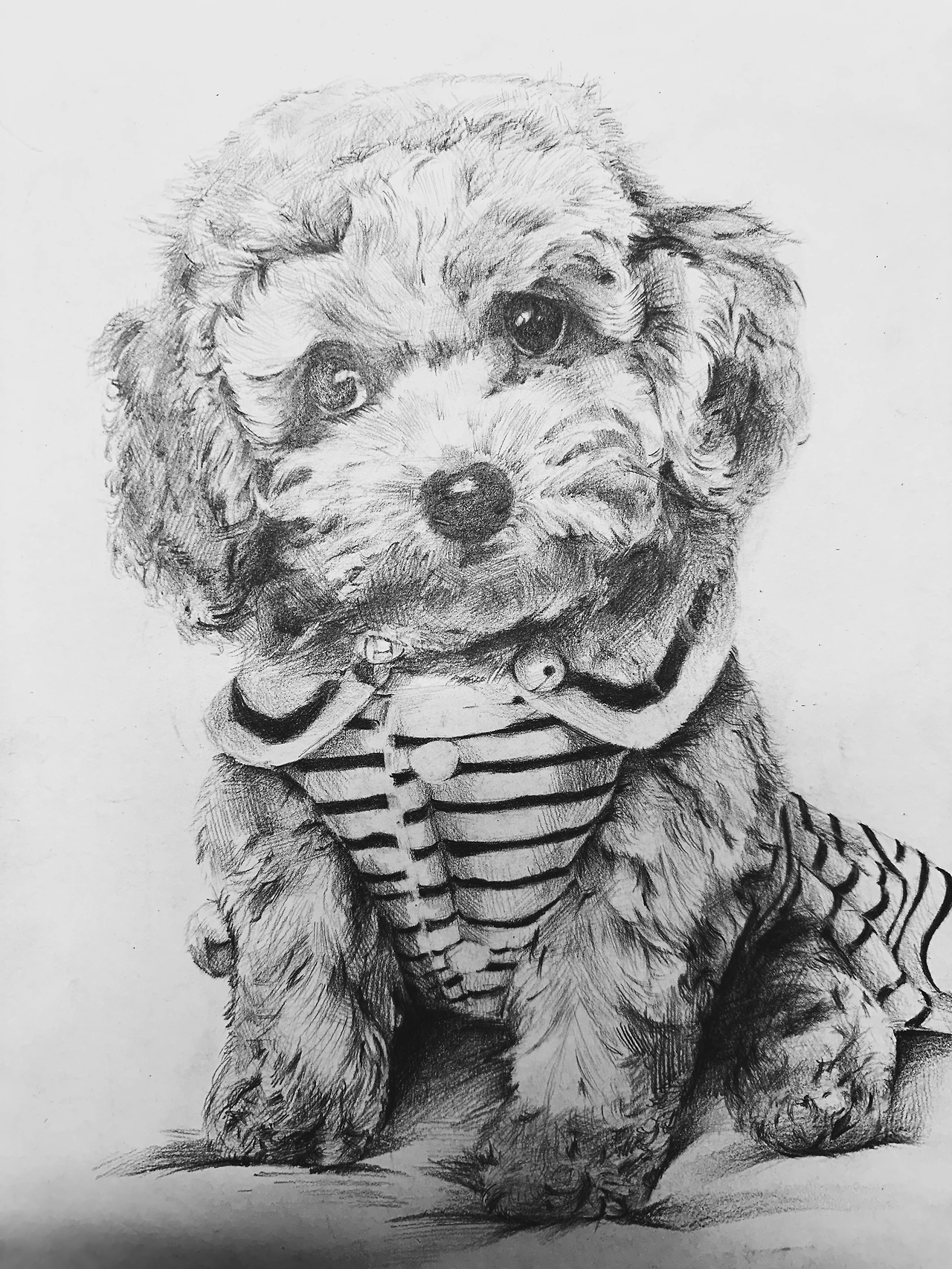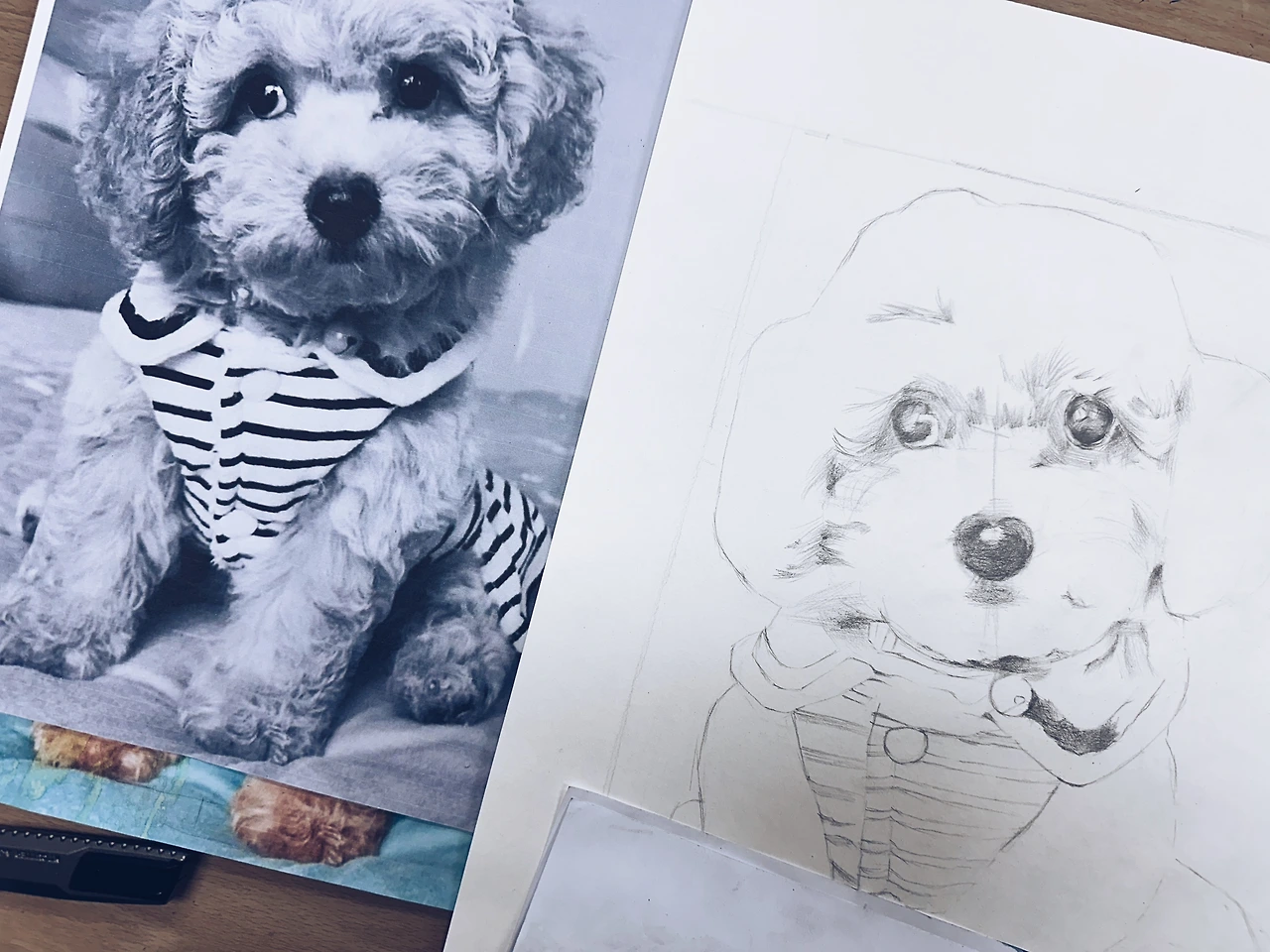 스케치할 때만 해도 강아지가 되긴 될까 싶었다. 털 묘사부터 옷의 주름까지 신경 써야 할 부분이 너무 많았다. 강아지의 전체적인 비율과 눈, 코, 입 위치를 잡는 데에만 한참이 걸렸다. 초반 스케치는 어딘가 엉성해 보였는데, 두 분의 선생님 모두 과정이 좋다는 말만 되풀이할 뿐이었다. “지금은 어색해 보이지만, 그게 맞아요.” 마음을 들켜버렸다.