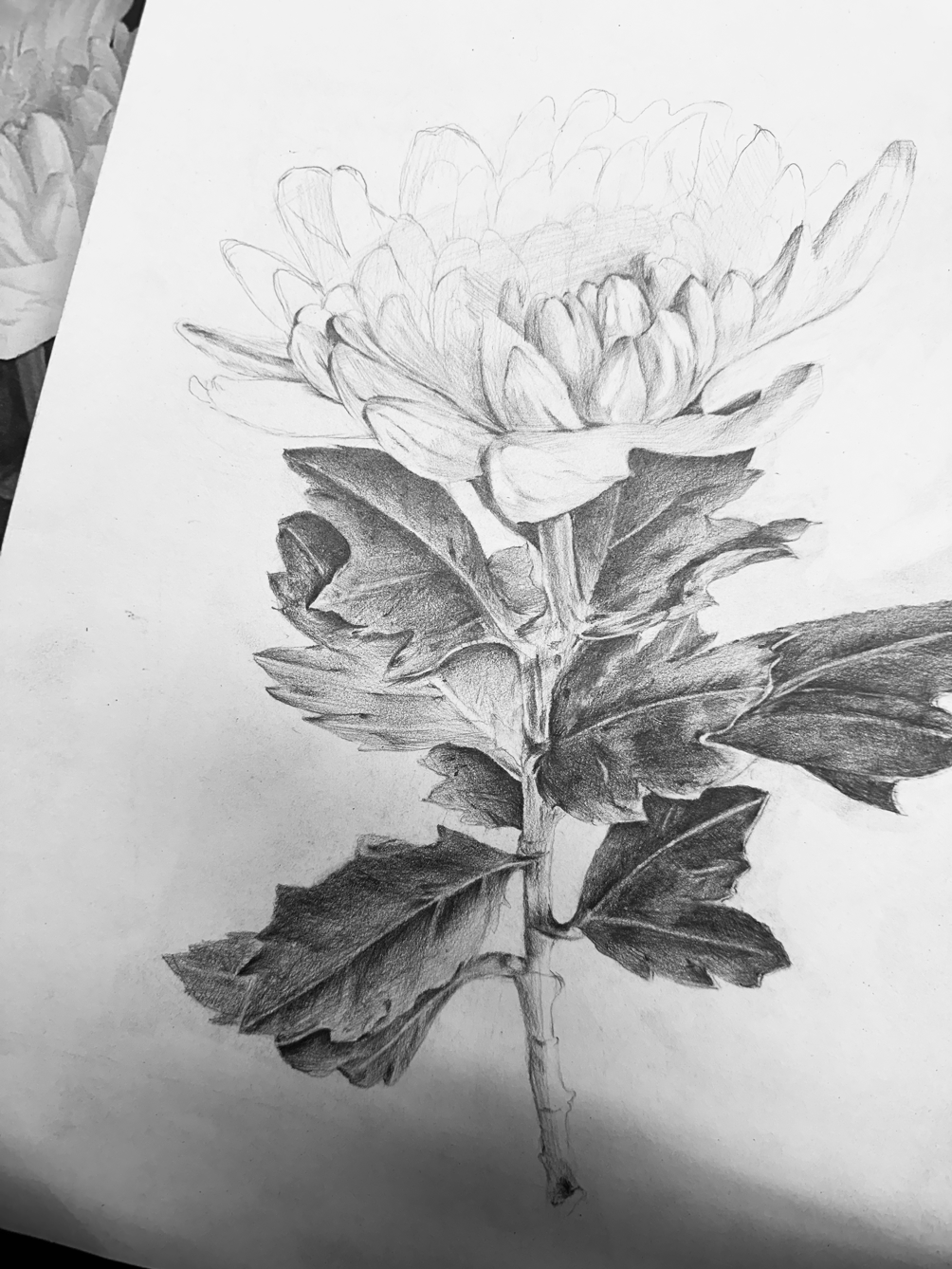 국화꽃줄기에 자라난 이파리로 시선이 옮겨간다. 자칫하면 꽃잎이 지나치게 어두워질 수 있으므로 손을 대기가 조심스럽다. 상대적으로 어두운 줄기 부분과 함께 이파리들을 잡고 나면 꽃잎은 비교적 그리기 수월해진다. 건네받은 레퍼런스는 이파리들이 얽혀있어 그림 안에서 떼어내는 작업이 필요했다. 한 송이의 국화꽃을 피워내기 위해서는 밝음과 어둠이 적절히 공존해야 하는 것이었다.