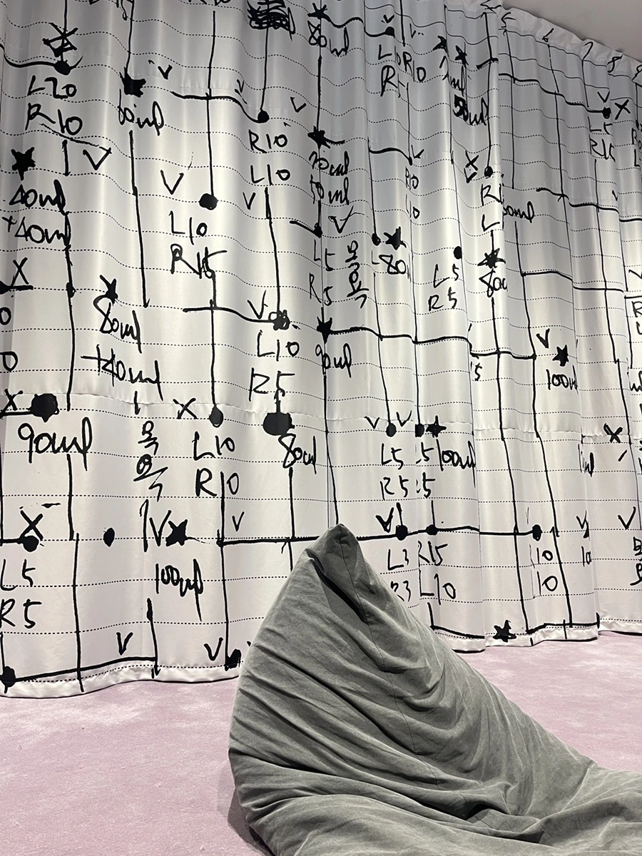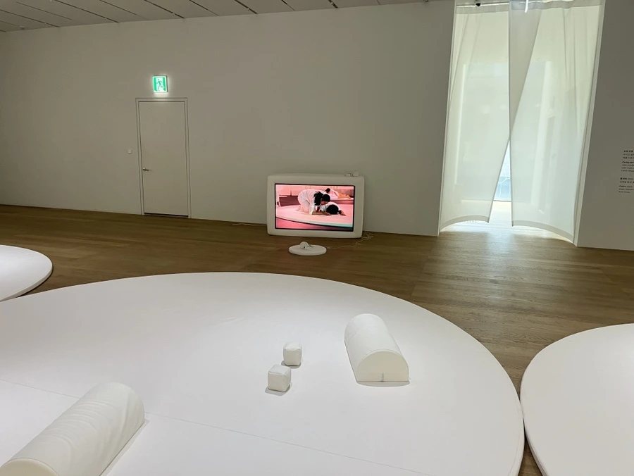 실제로 가정집, 어린이집, 병원, 요양원 등 돌봄이 이루어지는 장소에서 영감을 받아 제작된 설치 작품이라고 한다. 저 흰색의 쿠션이나 바닥 매트도 의료용으로 쓰이는 재활 치료 도구와 같은 소재라고. 어쩐지 아주 푹신 푹신하고 기분도 좋았다.