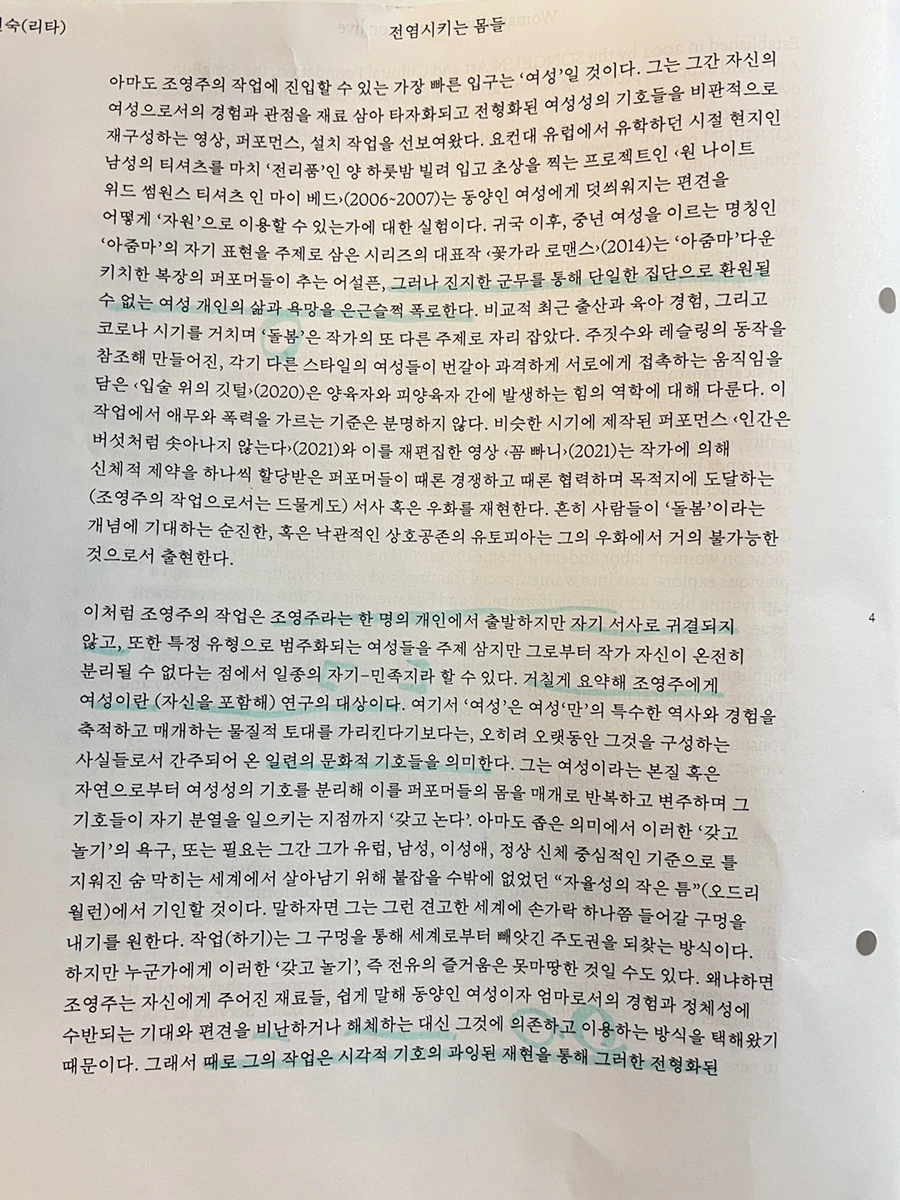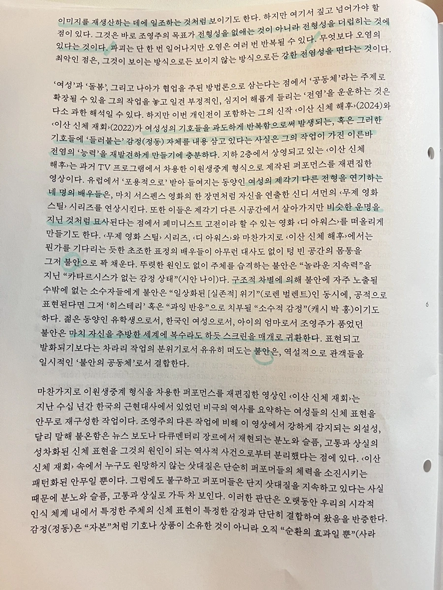 끝으로 갈 수록 나는 이 네 여성의 행동묘사와 옷차림, 화장 등 외면적인 부분에서의 불쾌감을 느끼게 됐다. 처음에는 어색함과 이질감 정도로 느껴졌던 감정이 나중에는 기괴하다는 생각으로 변했다. 여성다움을 연기하는 사람들. 그 연기 때문의 개인의 아름다움이 보이지 않았다. 기이하고 불편해보였다.