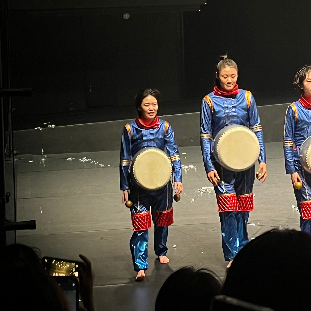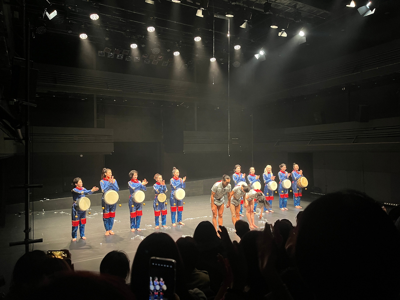 흰 천이 검은 공간을 차지하고 있는 지금, 사이보그 가족은 어디론가 가고 없고 새로운 집단이 등장한다. 커다란 북을 배에 붙이고 전통의상 같은 것을 입은 여자들이다. 이들은 과하게 해피한(?) 얼굴로 등장한다. 부른 배를 매만지면서, 마냥 해맑게 웃으면서. 아직도 떠오르는 건 가운데 있던 그 여성분이다. 진짜 너무 잘 웃으셔서 나까지 실소가 터져나왔던.. 나중에는 흰 천의 동그란 구멍으로 얼굴만 빼꼼해서 웃는다. 아 진짜... 엄청난 씬스틸러였다. 관객석의 웃음의 8할은 그분 때문에 생겨났을 것이다.