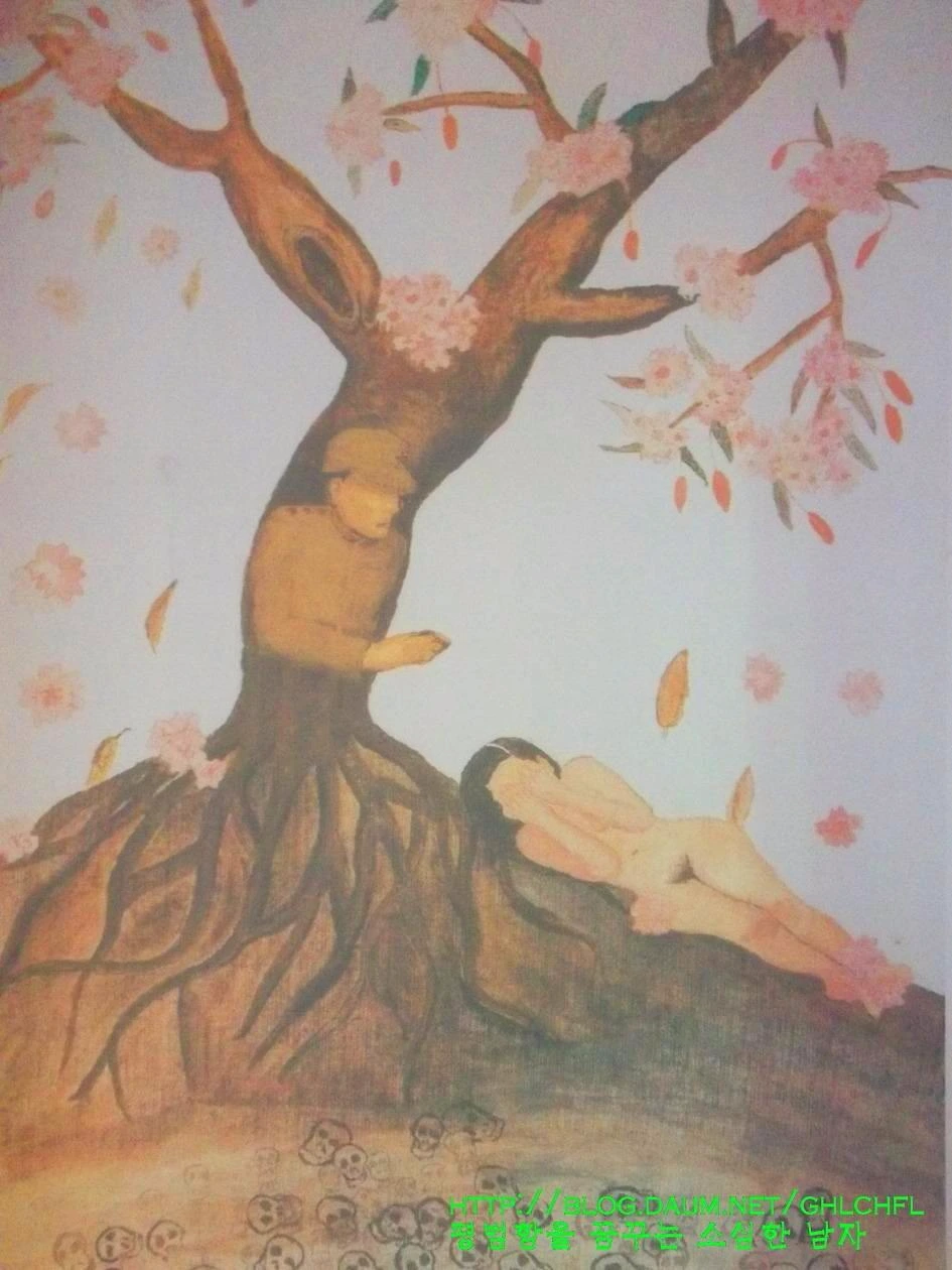 위 그림은 저에게 가장 인상 깊었던 작품이었습니다. 일본군들이 우리 할머니들의 청춘을 짓밟으면서 수치감과 함께 씻지 못할 고통을 새겨놓았습니다. 일본군의 만행은 할머니들의 가슴 깊은 곳까지 나무뿌리처럼 파고들어 오늘날까지도 할머니들이 얼굴을 들 수 없을 정도로 괴롭힘을 주고 있었습니다. 그리고 청춘의 꽃이 제대로 피지도 못한 채 땅으로 떨어진 자리에는 할머니들이 살아오는 동안 수십, 수백 번이나 죽어야 했던 당신들과 친구들의 유골이 나뒹굴고 있습니다.