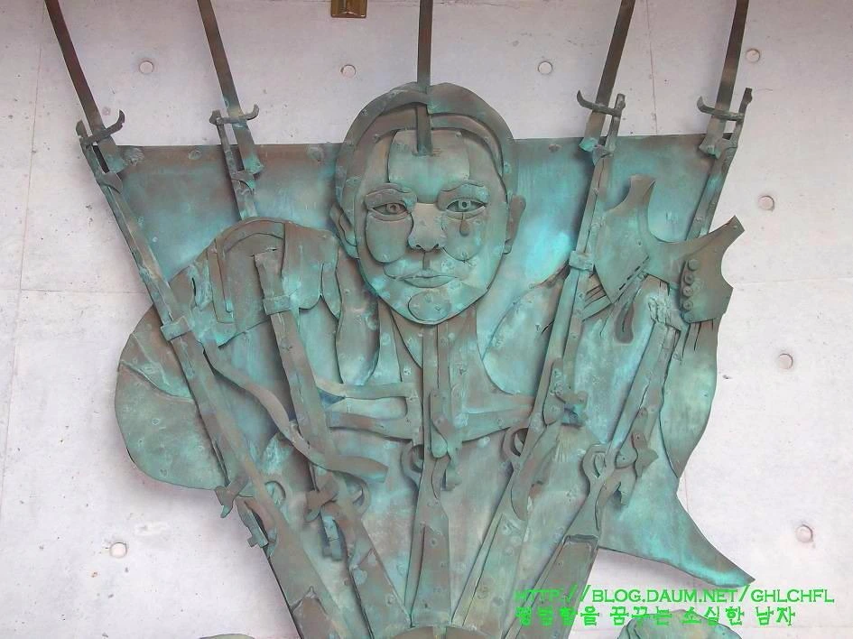 역사관으로 들어가는 입구에 걸려있는 작품은 할머니들을 잘 표현해 놓고 있었습니다. 일제의 무자비한 총칼이 온몸에 상처를 입히는 것도 모자라 지금까지 할머니들을 옴짝 달짝하지 못하게 고통을 주고 있습니다. 시간이 지나면 상처가 아물어야 하는데 일본의 반성하지 못한 채 적반하장식으로 할머니들을 비하하는 말과 행동은 다시 날카로운 총칼이 되어 할머니들에게 지금도 상처를 내며 괴롭히고 있습니다.