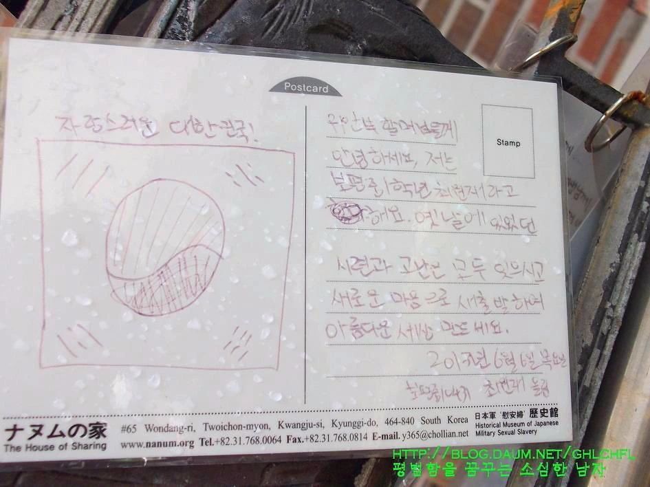우리가 해야 할 일은 일본을 비난하고 헐뜯어 분풀이를 하는 것이 아닙니다. 보다 성숙한 자세로 삐뚤어진 일본을 품에 안고 올바른 길을 찾아갈 수 있도록 도와주어야 합니다. 저는 가능하다고 생각합니다. 촛불집회와 같이 잘못된 것을 평화로운 방법으로 바로잡을 수 있는 역량을 우리는 가지고 있습니다. 그것도 한 번이 아닌 4.19 의거, 6월 민주항쟁 등 여러 번의 성공을 해본 경험을 가지고 있습니다. 그리고 엽서에 적혀있는 초등학생의 글에서 우리의 밝은 미래를 읽을 수 있습니다. 수업시간에 해결해야 할 진행형인 위안부가 아니라 마무리가 잘된 과거형의 위안부를 가르치는 날이 빨리 왔으면 좋겠습니다.