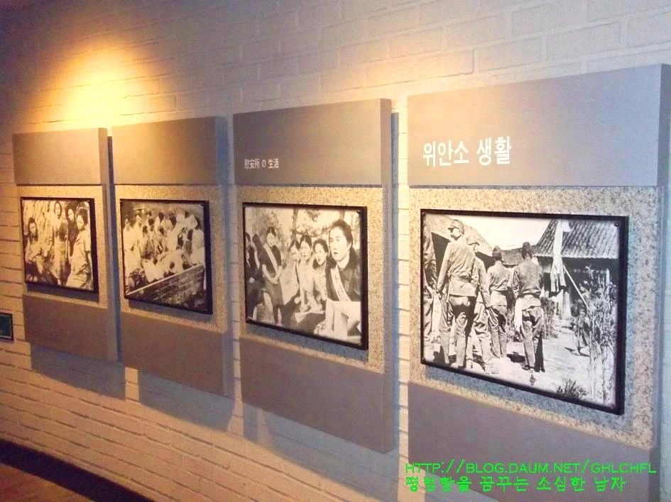 역사관 벽으로 위안부 생활을 알려주는 사진들이 전시되어 있습니다. 할머니들이 잊고 싶은 과거의 흔적들로 역사교과서에도 실려있는 우리에게 낯설지 않은 사진들입니다. 그러나, 자주 보던 사진이라고 흘려보내서는 안 되는 귀중한 사진입니다. 사진 속에 많은 이야기들을 담을 수는 없습니다. 그러나 이 사진을 통해 할머니들의 아픔과 고통을 함께 공유하며 잊지 않는다면 잘못된 역사를 우리는 바로 잡을 수 있을 것입니다.