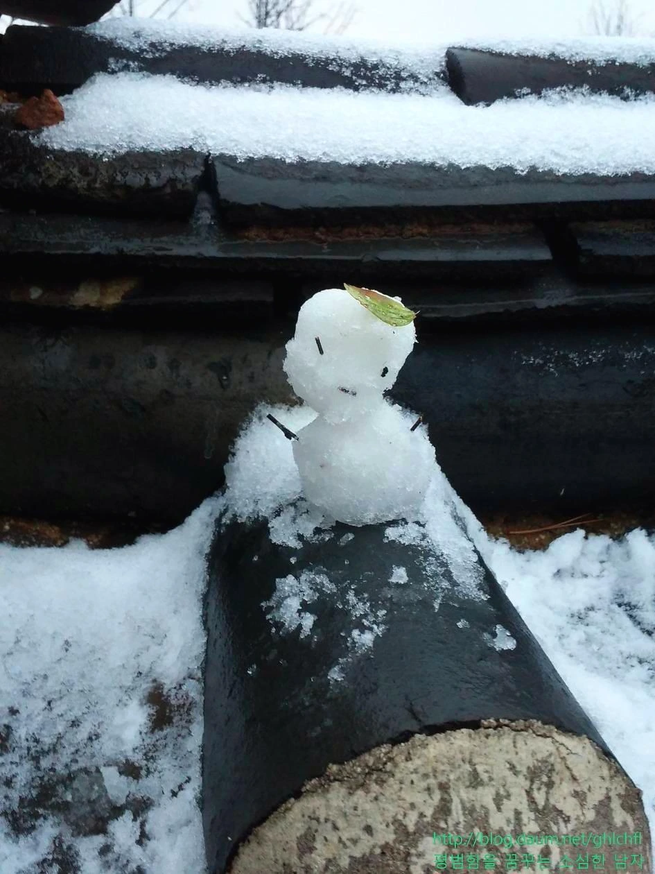 산사원 박물관을 나와 야외로 나오자 딸들은 우리 속에 갇혔다 탈출한 강아지들마냥 뛰어다니기 시작했습니다. 여기저기 눈을 밟으며 돌아다니는 애들을 보며 아무 관심도 없는 박물관에 가두어놓은 것 같아 미안했습니다. 미안한 마음에 폴짝폴짝 뛰어다니는 아이들과 어울려 눈싸움을 하며 신나게 놀았습니다. 눈싸움 이후 정원으로 가는 길목에서 둘째 딸과 작은 눈사람을 만들었습니다. 고사리 같은 손으로 눈사람을 만드는 딸의 모습이 너무나 귀여웠습니다. 그리고 둘째가 만든 눈사람도 딸을 닮아 앙증맞고 귀여웠습니다. 저는 눈사람 하면 연탄재에 눈을 묻혀서 사람처럼 크게 만들어야 한다는 생각에서 벗어나지 못하고 있었습니다. 그래서 아이들이 눈사람 만들자고 하면 큰 눈사람을 만들기 위해 고생해야 한다는 생각에 고개를 절레절레 흔들며 핑계를 대기 바빴습니다. 작은 눈사람을 보며 정작 아이들이 무엇을 원하는지를 모르고 키우고 있다는 반성을 하는 순간이기도 했습니다.