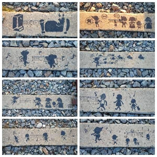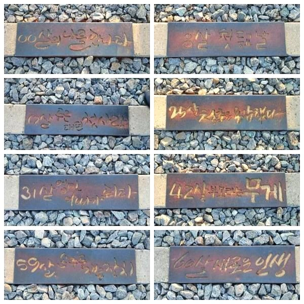 항동 철길을 방문하기 전 저만의 목표가 있었습니다. 어떤 블로그에서도 침목에 새겨진 문구를 모두 담아 놓은 것을 보지 못했던 저는 한 장의 사진에 문구와 그림을 모두 담고 싶었습니다. 아이들을 항동 철길 옆 교회에서 운영하는 유료체험활동에 보내고 고개를 푹 숙인 채 걸어가며 사진을 찍었습니다. 그리고 한 장의 사진에 문구를 모두 담아두는 순간 얼마나 뿌듯했는지 모릅니다.