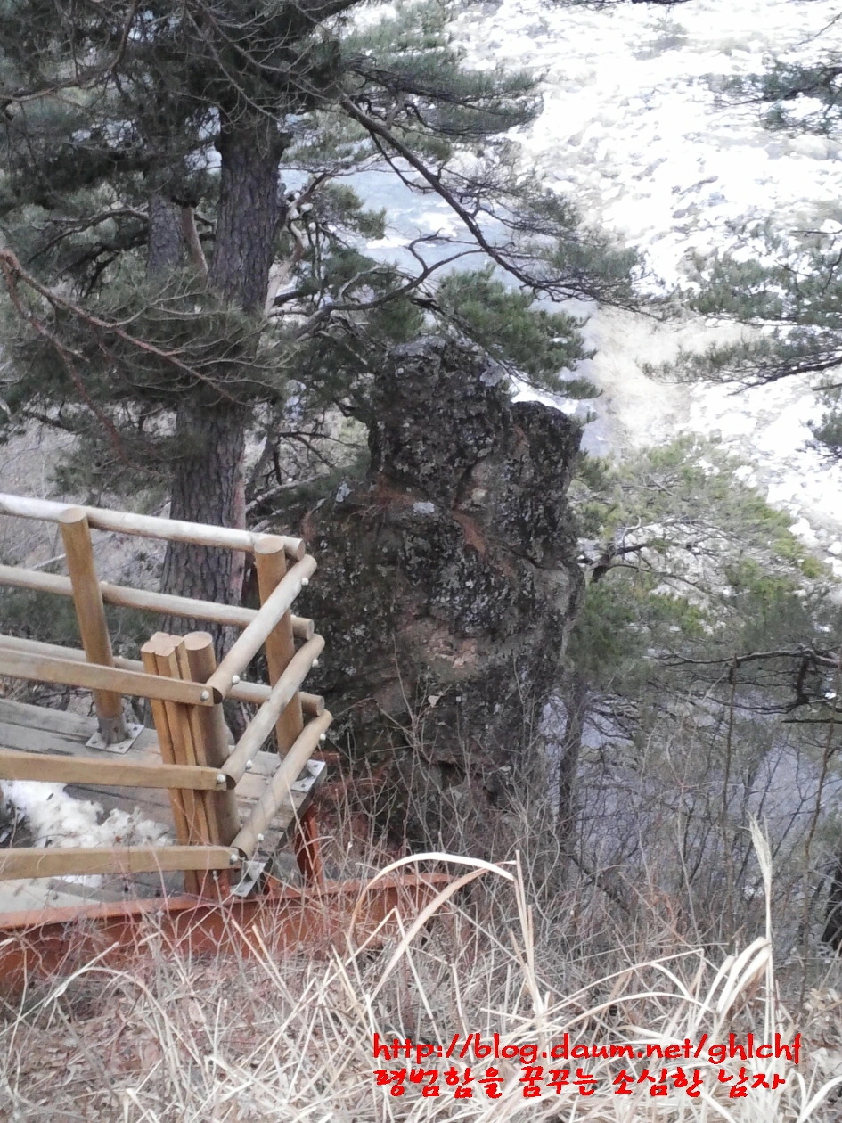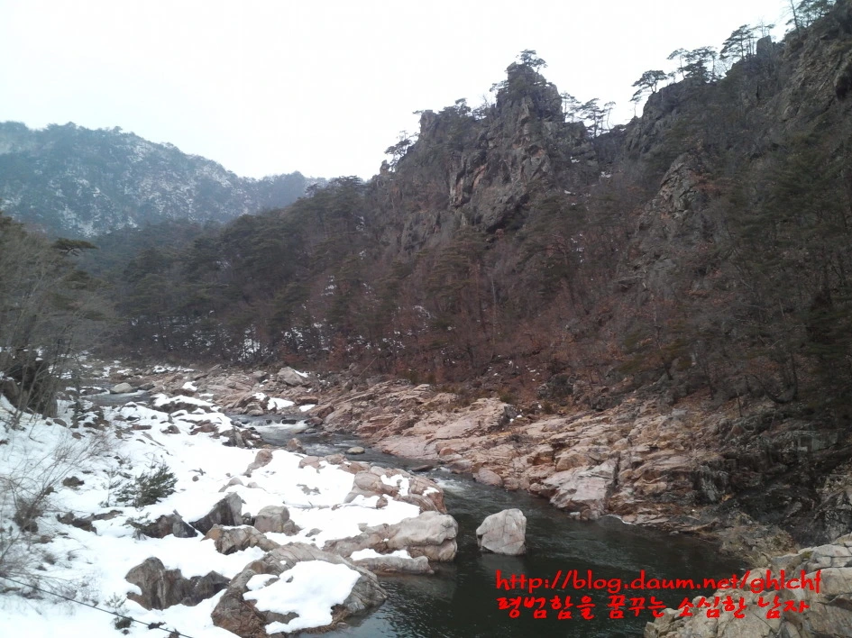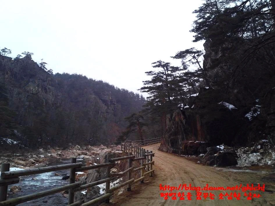 여행은 주로 1박 2일 일정으로 가족들과 함께 떠납니다. 여행을 자주 할 수 있는 여건이 아니기에 현지에서 먹는 아침식사로 여행을 시작합니다. 그리고 다음날 저녁을 먹고 서울로 출발을 하면 웬만한 2박 3일 코스를 소화하는 여행이 됩니다. 울진으로 떠나는 여행도 모두가 곤히 잠들어 있는 시간에 출발하여 어두컴컴한 밤길을 내달려야 했습니다. 날이 밝아올 무렵 울진으로 들어가는 불영사 계곡 초입에 들어설 수 있었습니다. 울진 초입까지 꼬불꼬불한 산길을 어둠 속에서 달리면서 도로 위 빙판으로 한순간도 긴장을 놓지 못했습니다. 내비게이션에서 불영사가 얼마 남지 않았다고 알려주자 몸에 긴장이 풀리기 시작했습니다. 긴장이 풀리자 주변 경관이 눈에 들어오면서 사랑바위를 구경도 할 겸 잠시 쉬어가기로 했습니다. 차를 세우고 잠들어 있는 가족들을 깨웠지만 잠이 덜 깼는지 차 밖으로 나가기 싫다고 해서 혼자 사랑바위로 향했습니다.