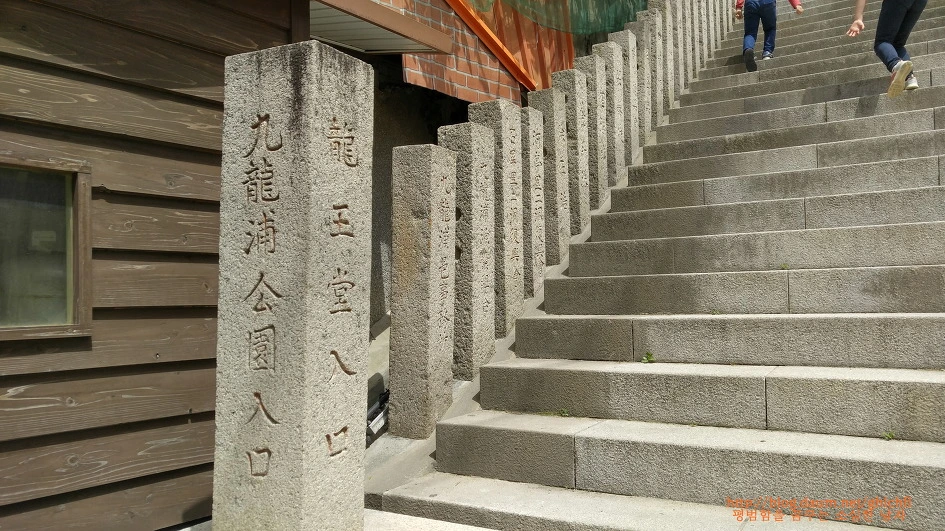 이곳에 들어서면 바로 보이는 계단 좌우로 구룡포항을 조성하는데 기여한 일본인들을 기념하기 위해 만든 돌기둥 120개가 있습니다. 그러나 자세히 보면 모든 돌기둥마다 일본인 이름을 시멘트로 메꾼 흔적을 볼 수 있습니다. 이 곳 주민들이 구룡포항을 조성하는데 기여한 일본인들의 이름을 다 지워버린 것이죠.