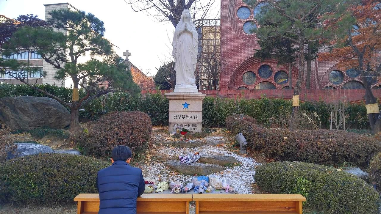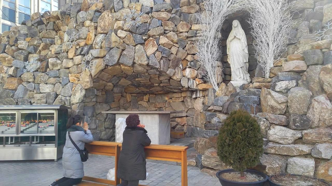명동성당 뒤편 마리아에게 기도를 올리는 신도