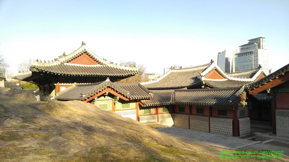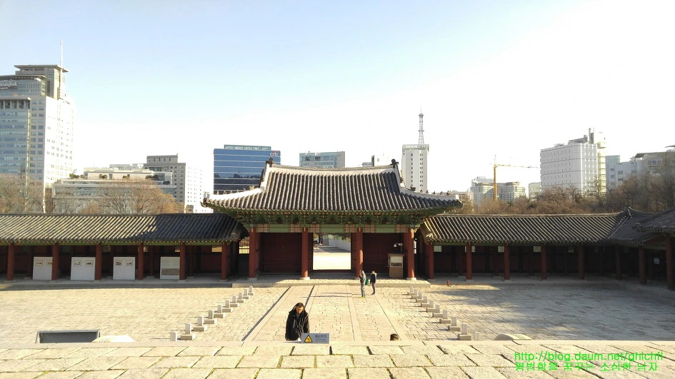 숭정전에서 바라본 전경은 덕수궁에서 시청의 높은 건물들을 보았던 때와 크게 다르지 않습니다. 조선시대 가장 큰 건축물이었던 궁궐이 이제는 가장 낮은 자세로 높은 빌딩에 둘러싸여 복잡한 현대인에게 휴식을 안겨주는 공원으로 변화되어 가고 있음에 세월의 무상함을 느끼게 됩니다.