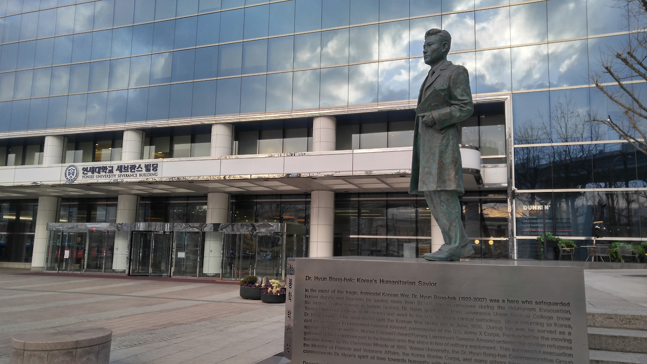 세브란스 빌딩 앞 동상의 주인공은 한국의 쉰들러라 불리는 현봉학(1922~2007) 선생이다. 현봉학(이후 선생은 생략)은 일제에게 나라를 빼앗겼던 시절인 1922년 함경북도 성진에서 태어났다. 목사와 장로교 여전도회장을 맡았던 어머니 밑에서 인간을 사랑하는 마음을 배운 현봉학은 늘 다른 사람에게 자신의 것을 양보하고 배려하는 태도를 몸에 익혔다. 현봉학은 어린 시절 아버지가 위암으로 고생하다 돌아가시는 모습을 보며, 의사가 될 것을 결심하고 세브란스 의학전문학교에 입학하였다. 그리고 누구보다 더 큰 노력을 기울이며 학업에 몰두한 결과, 해방되던 1945년 세브란스 의학전문학교를 졸업할 수 있었다.