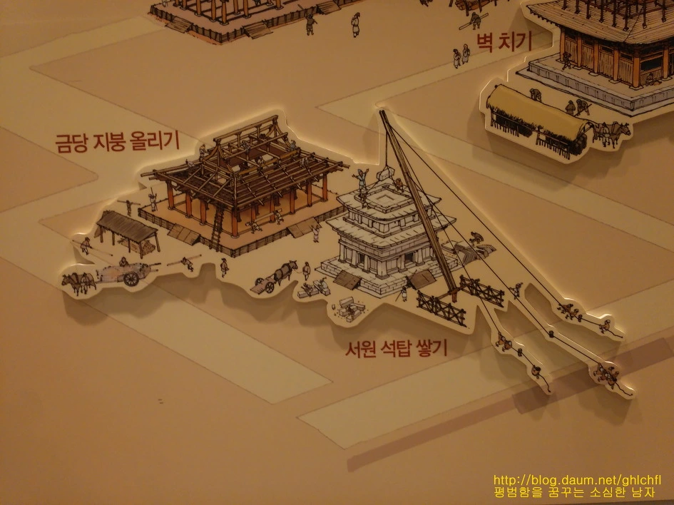 또한 박물관에는 과거 미륵사를 축조하는 모습을 그림으로 표현한 자료도 볼 수가 있어서, 그 옛날 석탑을 어떻게 축조했는지 알 수 있도록 도와주고 있습니다.