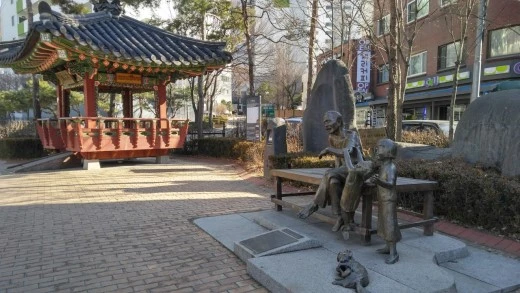 수락산역에서 내려 걷다가 건물을 끼고 돌아서면 커다란 바위로 웅장함을 주는 수락산을 마주하게 된다. 그 밑으로 한적함을 주는 마을이 있다. 마을을 둘로 나누는 도로 옆으로 조그마한 공원이 있다. 공원에는 한자로 귀천정이라 적힌 정자와 해맑은 웃음을 터트리는 아저씨와 두 꼬마의 동상이 있다. 두 아이는 아저씨에게 놀아달라며 매달리지만, 아저씨는 귀찮아하기보다는 아이들과 함께 있음에 행복해한다. 그 옆으로 조금 멀찍 떨어진 곳에는 강아지가 아저씨의 한쪽 신발을 가지고 장난치고 있다.