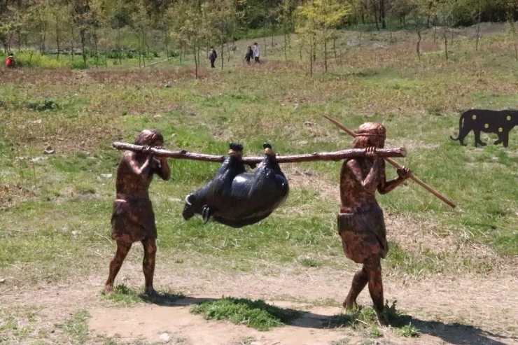 여러 채의 집들로 이루어진 선사체험 마을 주변으로 동으로 만들어진 여러 인형은 선사시대 식량 구하는 모습을 재현하고 있다. 사냥한 멧돼지를 나무에 매달고 내려오는 두 개의 인형은 가족들을 배불리 먹일 수 있다는 즐거움에 행복하면서도 힘들어하는 모습이 재현되어있다. 개울이 흐르는 곳에서는 작살을 들고 물고기를 잡으려는 모습, 농사짓는 모습 등이 여기저기 재현되어있다. 이는 선사시대의 경제활동을 모두 재현하려는 의도도 있지만, 부수적인 교육적 효과도 가져온다. 학교에서 선사시대의 생활상을 공부할 때, 구석기 시대의 사냥과 어로가 신석기시대 농경으로 변한다고 배운다. 그 과정에서 사냥과 어로가 끝나고 농경이 시작된다고 생각하는 경우가 많다. 특히 농어촌의 생활을 경험하지 못한 아이들의 경우 오해의 정도가 더 크다. 혹시라도 역사를 접하는 아이들이 있다면 사냥과 어로라는 경제활동에 농경이 추가되었음을 알려줘도 좋을 것이다.