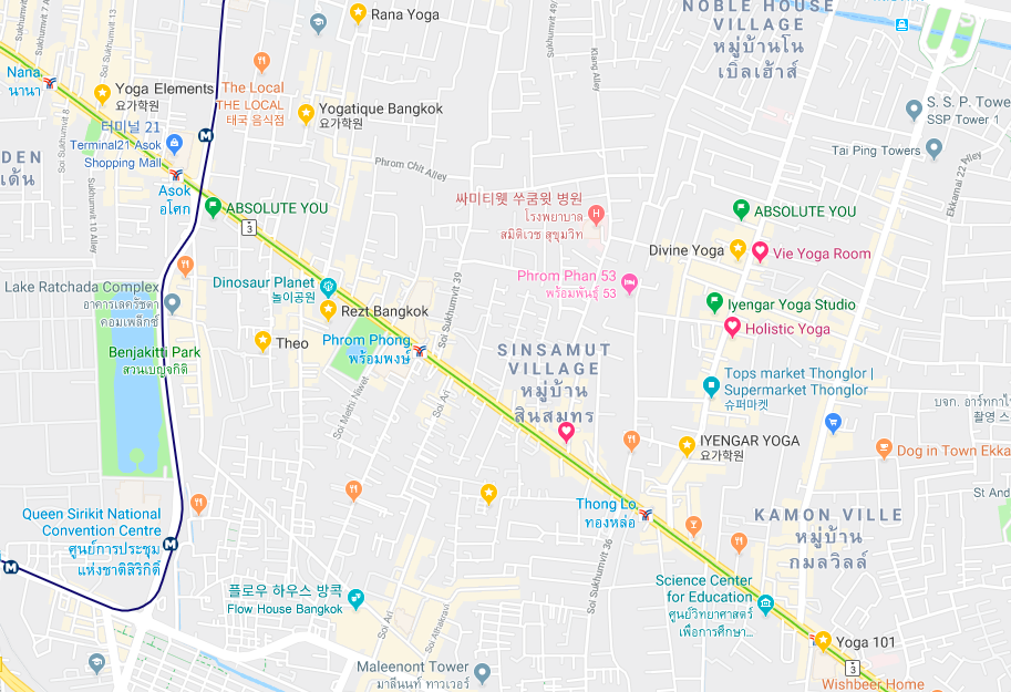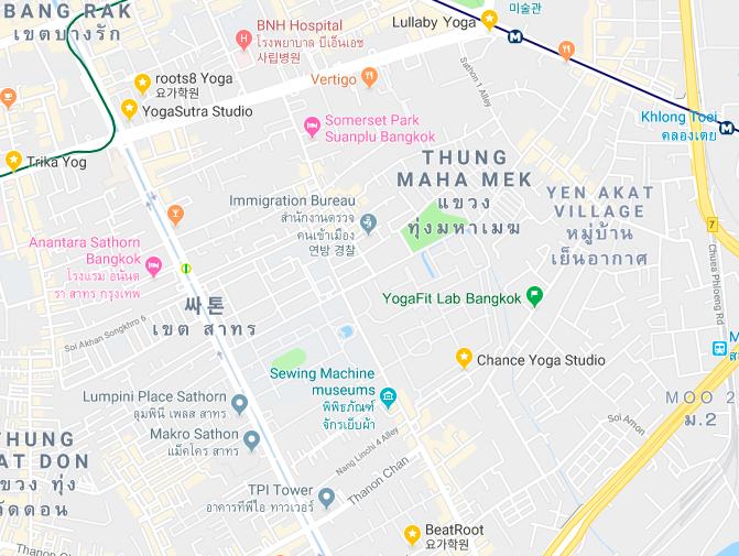 그 아래 사톤 지역 : BeatRoot, Chance Yoga Studio (여기는 지하철역과 거리가 애매하여, 숙소로 돌아가기 위해서 택시를 타고 Lumphini 역으로 이동했었다.)