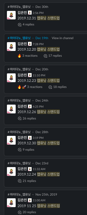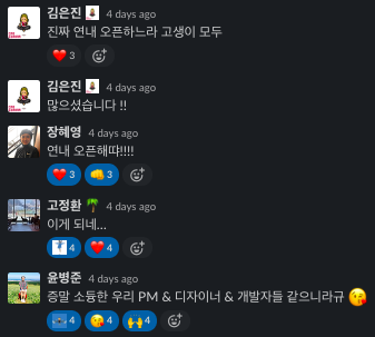 오픈 직전 일요일 저녁에 새로 파서 다음날 새벽 2시 33분까지 이어진 119개의 Thread 대화를 다시 살펴보면서, '프로덕트 연내 오픈 목표' 라는 일정상의 목표가 단지 라이브만을 의미하는 건 아니라는 생각을 했다. 연말연초휴일 고려해서 유저분들에게 발생할 수 있는 이슈를 최대한 빨리 확인하고 수정할 수 있도록, 그래서 유관 팀 크루들이 덜 고생하실 수 있도록, 굳이 주말밤시간까지 시간을 땡기고 땡겨 진행하는 멤버들을 보며 말이다.