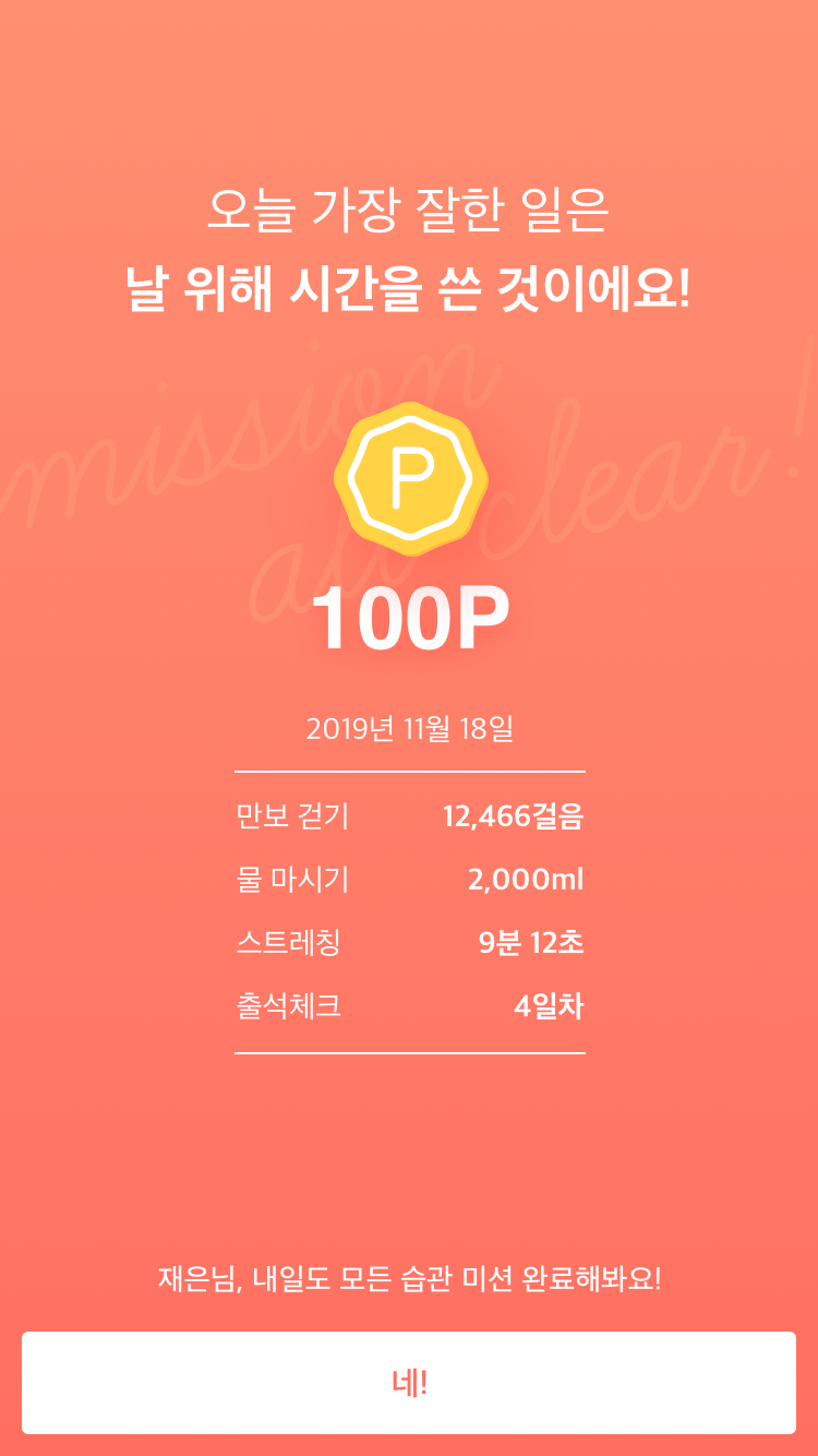 프로덕트 매니저로서 바라보는 포인트는 단순히 "아~ 오늘 포인트 벌었다!" 와 같은 금전적인 게 아니고, "나 오늘 하루 (완전 망한 거 아니고) 다노하게 살았구나!" 의 안도감과 같은 감정적인 것이었다.