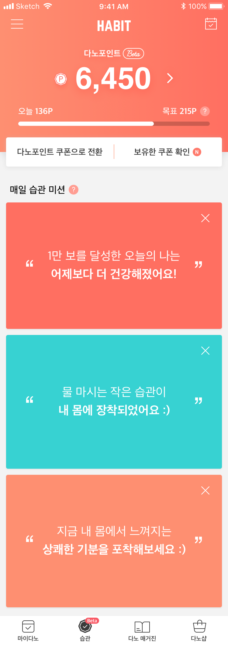눈뜨자마자 스트레칭을 하고, 오늘 하루 조금 더 걷고자 노력하며, 물 한잔 더 챙겨 먹기 위해 노력하는 24시간의 모든 순간 속에서 다노앱의 '습관' 메뉴가 흔들리는 우리들의 마음을 다잡아 주기를 바라는 마음. 그리고 미션 클리어하는 순간순간에 유저들이 더욱 성취감을 맛볼 수 있었으면 하는 마음으로 이렇게 준비를 했다.