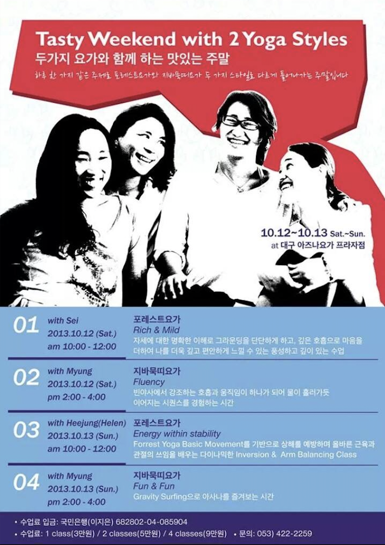 그렇게 지바묵티, 아행가, 포레스트에 빠졌다. 그런데 정작 한국에서는 수련할 수 있는 곳이 아주 많지는 않았다. 그래서 주말에 대구건 신촌이건 그게 어디건 수련을 하러 선생님들을 따라다녔었다.