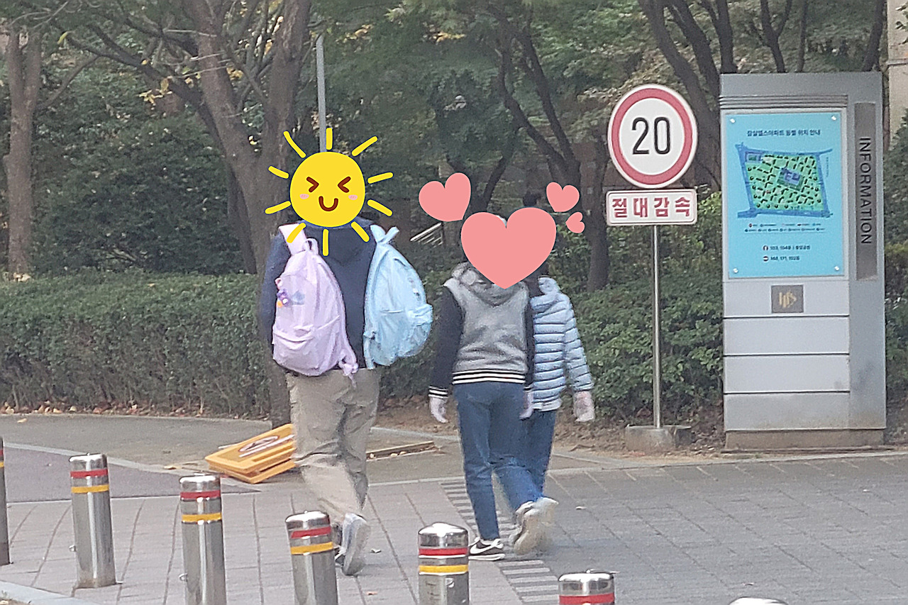두 딸의 책가방을 든 아빠