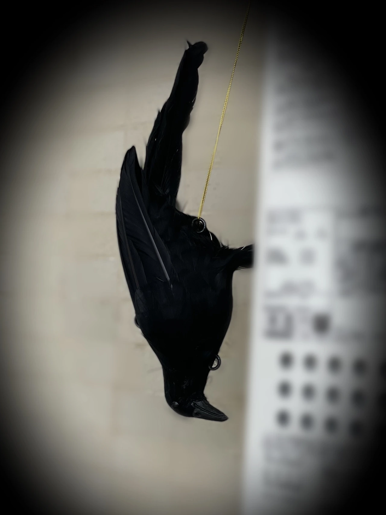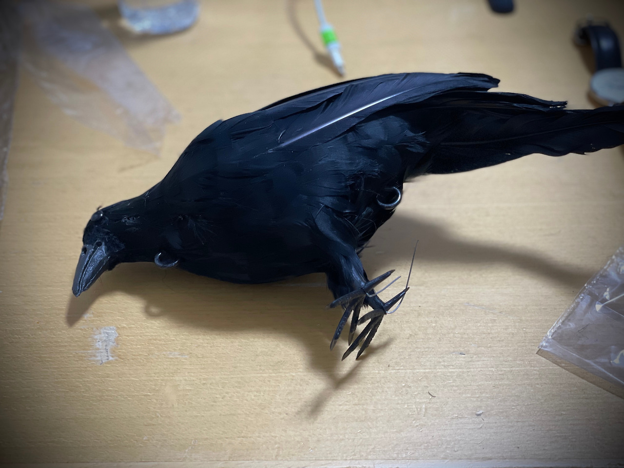 까마귀가 무서워하는 것이 동족의 죽음으로, 거꾸로 걸어둔 시체를 보는 것으로 두려움을 느낀다는 글에 진짜 시체는 걸 수 없으니 인터넷쇼핑으로 가짜 시체를 구입했다.