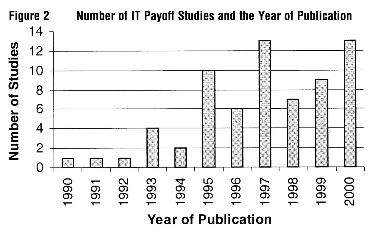 많이 논의된 “생산성 역설”(Ahituv and Giladi 1993, Roach 1987, Strassmann 1985)은 최근 연구들(Brynjolfsson and Hitt 2000, Jorgenson 2001, Jorgenson and Stiroh 2000, Kraemer and Dedrick 2001, Oliner and Sichel 2000)에 의해 대부분 해결되었지만, 모든 연구가 IT 투자에서 명확한 수익성을 보여준 것은 아니다.