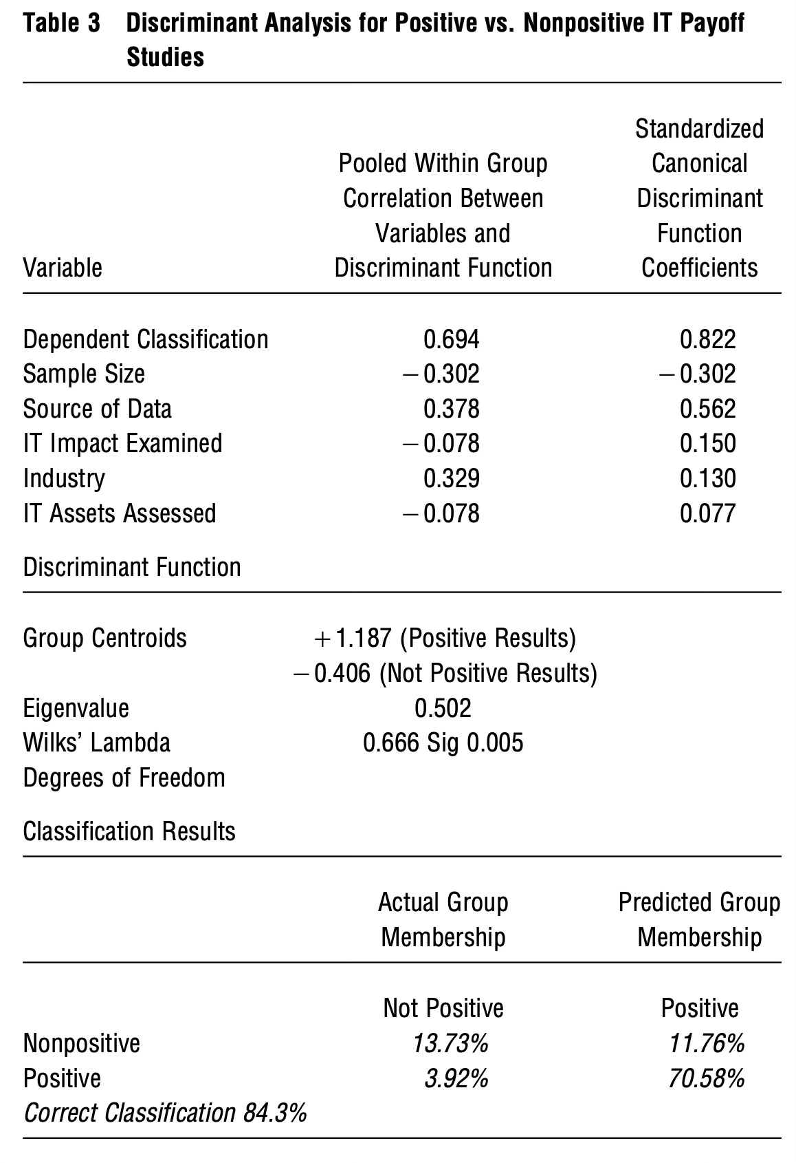 Employing logistic regression and discriminant analyses, we present statistical evidence of the characteristics that discriminate between IT payoff studies that observed a positive effect and those that did not.