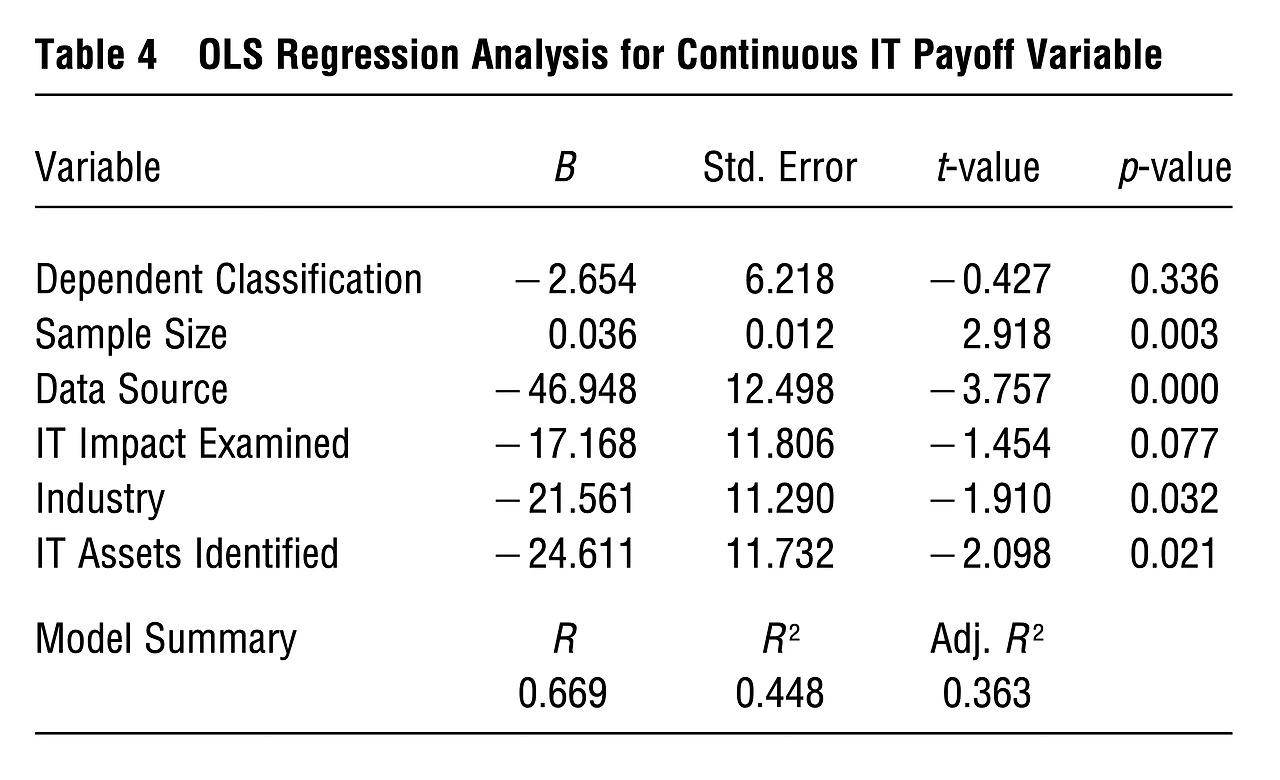 In addition, we conduct ordinary least squares (OLS) regression on a continuous measure of IT payoff to examine the influence of structural variables on the result of IT payoff studies.