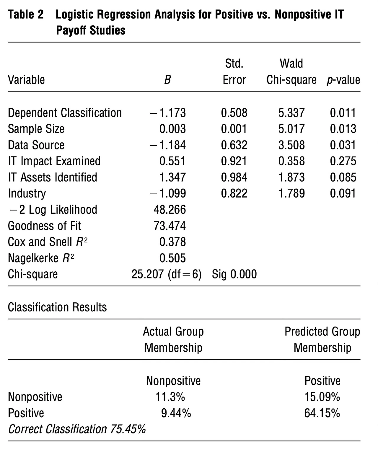 로지스틱 회귀 분석과 판별 분석을 사용하여, IT 수익성 연구에서 긍정적인 효과를 관찰한 연구와 그렇지 않은 연구를 구별하는 특성에 대한 통계적 증거를 제시한다.