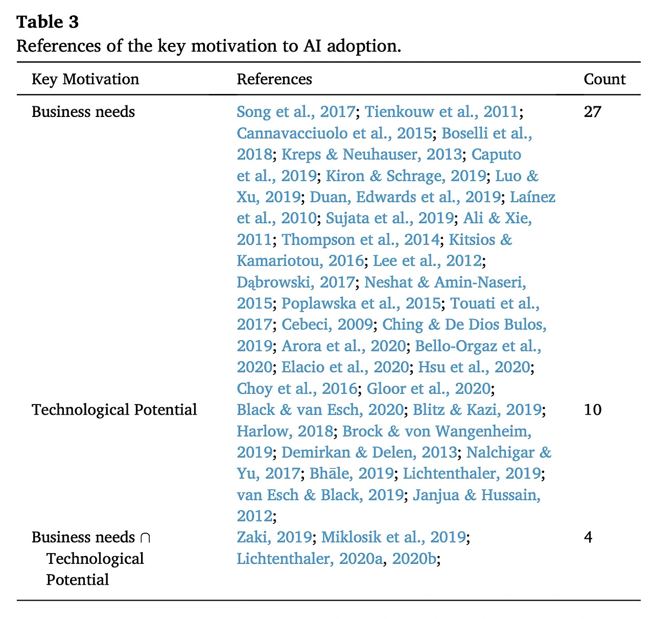 비즈니스 세계의 경쟁 시나리오와 대량의 데이터, 부족한 자원, 의사 결정에서의 신속성이 요구되는 상황을 고려할 때, 많은 조직들은 AI 기술을 도입할 동기를 부여받고 있으며, 이는 주로 주요 디지털 기업들이 보여준 파괴적 잠재력 덕분이다 (Bean, 2019; Chakravorti, Bhalla, & Chaturvedi, 2019; Davenport, 2018; Venkatraman, 2017).