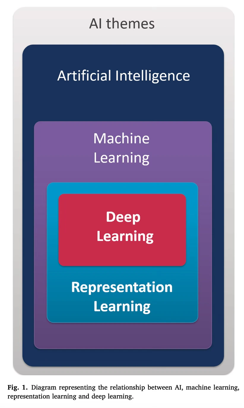 이 다이어그램은 딥 러닝이 표현 학습의 일종이며, 이는 여러 머신 러닝 접근법에 사용되지만 모든 접근법에 해당하지는 않음을 보여준다. 또한 머신 러닝은 AI의 일종으로 간주된다.