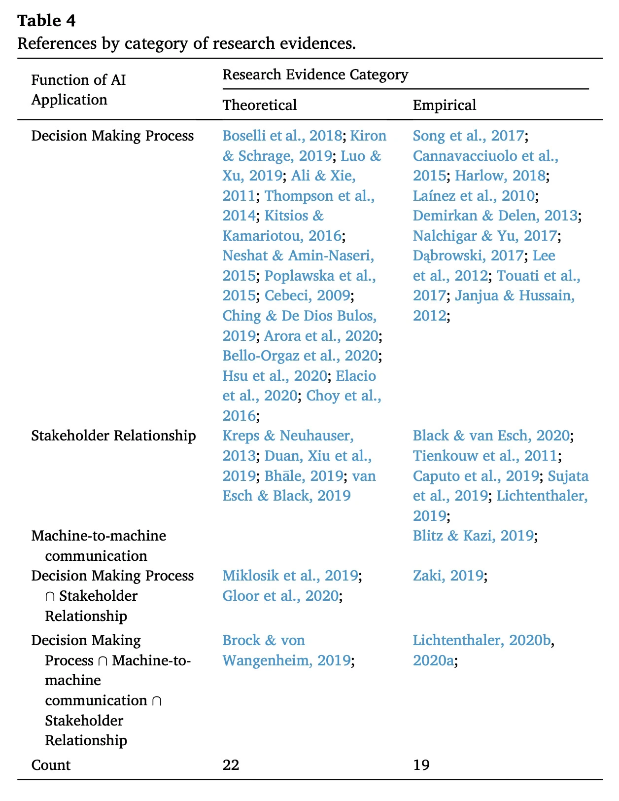 문헌은 AI의 전략적 사용을 다음과 같은 방식으로 다루었다: (i) 의사결정 지원 관점에서 의사결정 과정을 돕기 위해, (ii) 자동화, 고객 및 직원 참여 차원에서 고객 관계를 개선하기 위해, (iii) 신제품 및 서비스 제공을 위한 기계 간 통신을 가능하게 하기 위해.