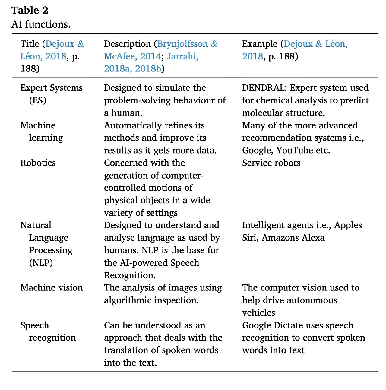 AI의 정의에 대한 합의가 어려운 점은 앞서 논의되었지만, 이 체계적 문헌 검토에서는 Dejoux와 Léon (2018)이 설명한 AI 기능에 초점을 맞춘다. 다양한 기능 범위는 아래의 표 2에 나타나 있다.